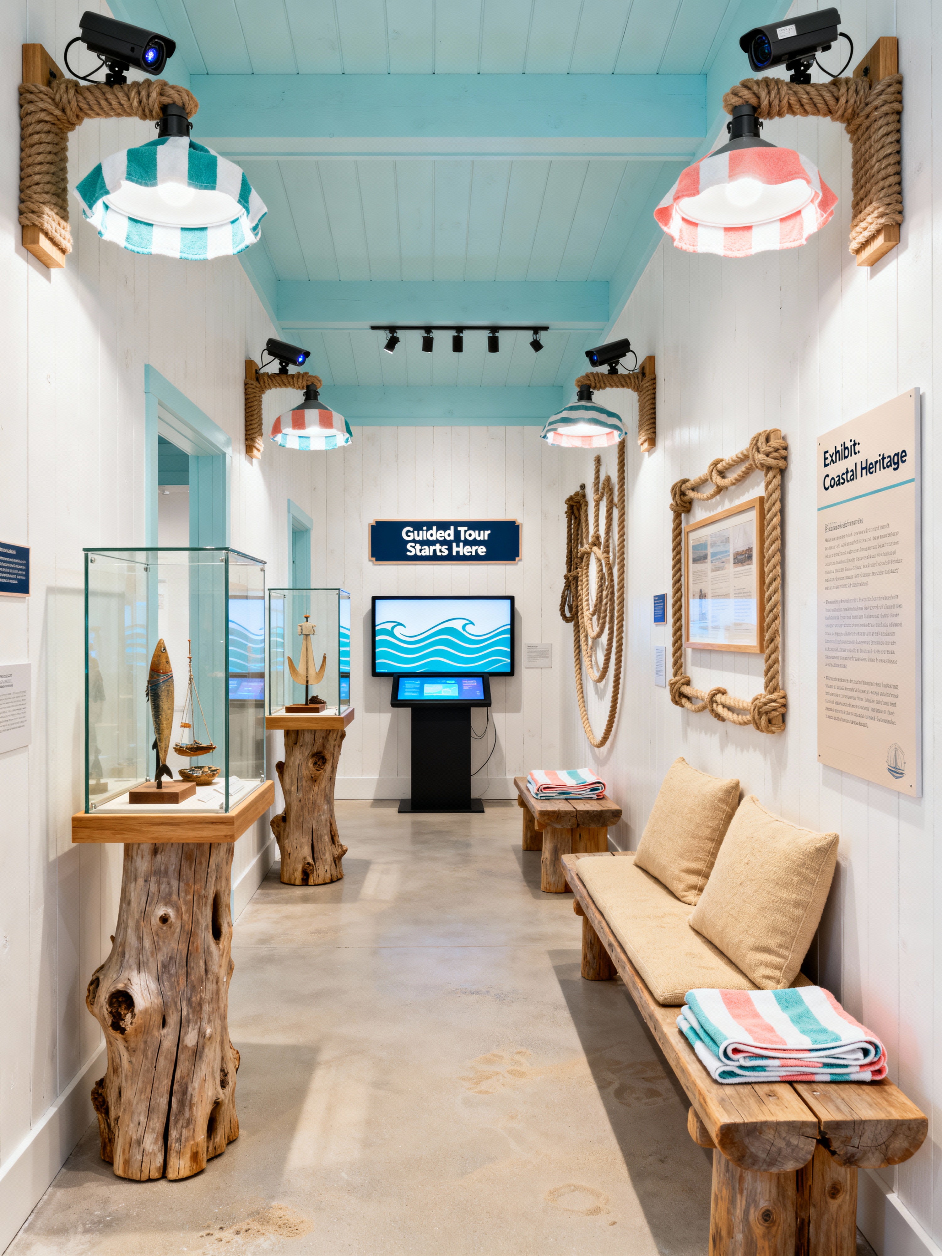 museum hall with surf shack style with artifacts and display cases and pedestals and interactive displays and guided tour signs and information plaques and security cameras and spotlights. . with white-washed walls and beach vibes and driftwood furniture and nautical rope and ocean-inspired colors and beach towels and sand-colored textiles and relaxed atmosphere