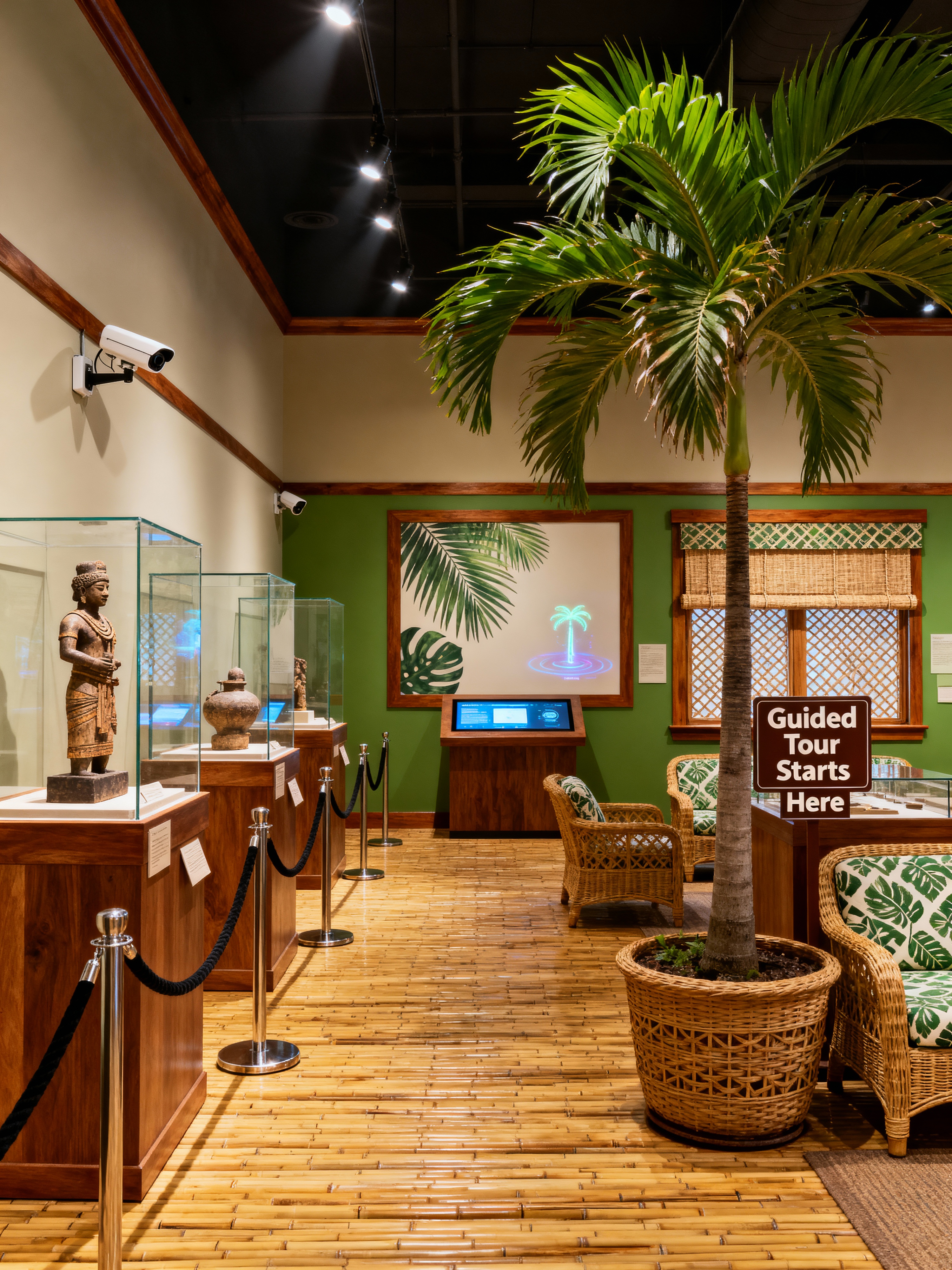 museum hall with tropical style with artifacts and security cameras and barriers and guided tour signs and spotlights and interactive displays and pedestals and display cases. . with rattan and wicker and bamboo and teak and palm trees and palm leaves and cane motifs and lattice prints