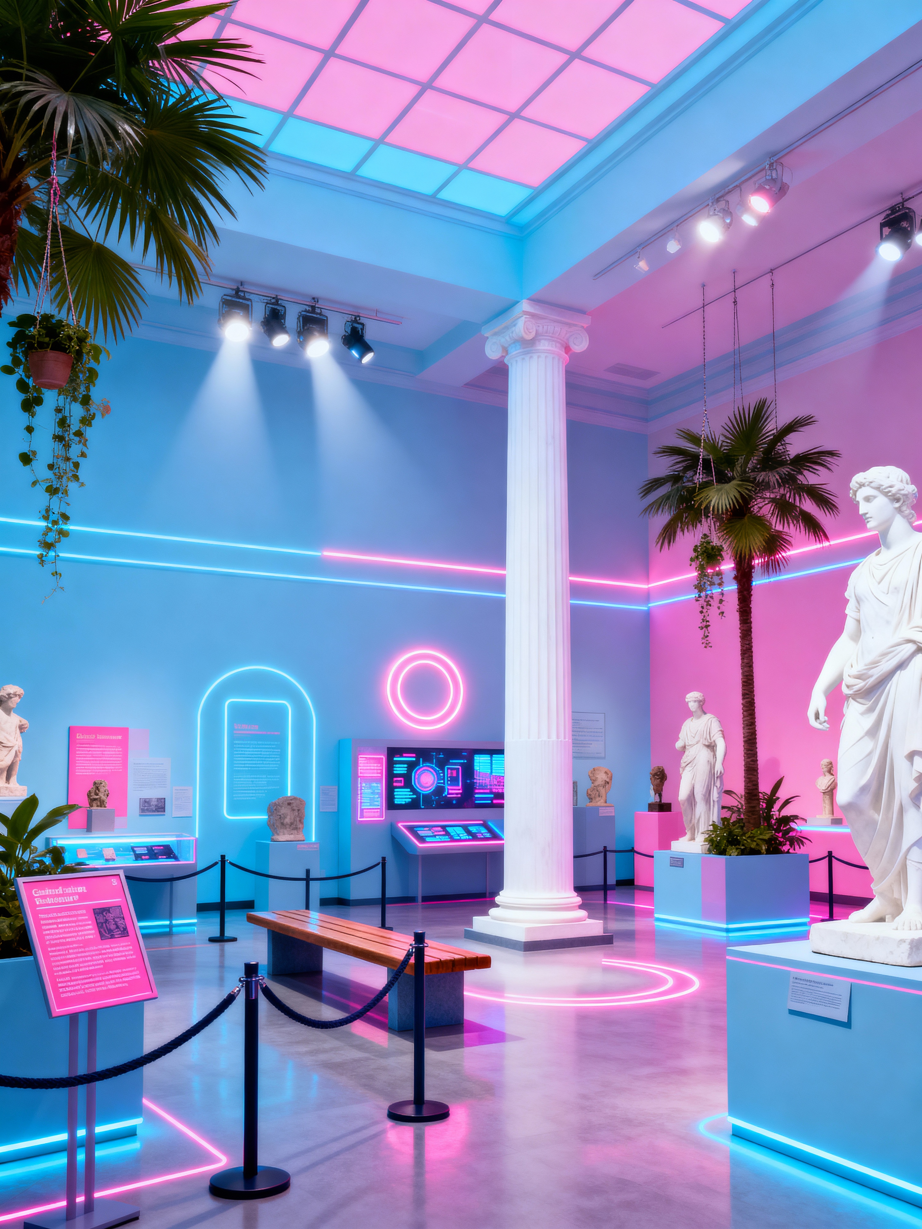 museum hall with vaporwave style with barriers and information plaques and guided tour signs and spotlights and artifacts and benches and interactive displays and pedestals. . with neon glow and white roman statues, white roman sculptures, white roman columns, white roman pillars in the center of the room, and hanging plants and baby blue and palm trees and palm trees and white roman statues, white roman sculptures, white roman columns, white roman pillars in the center of the room, and bright pink