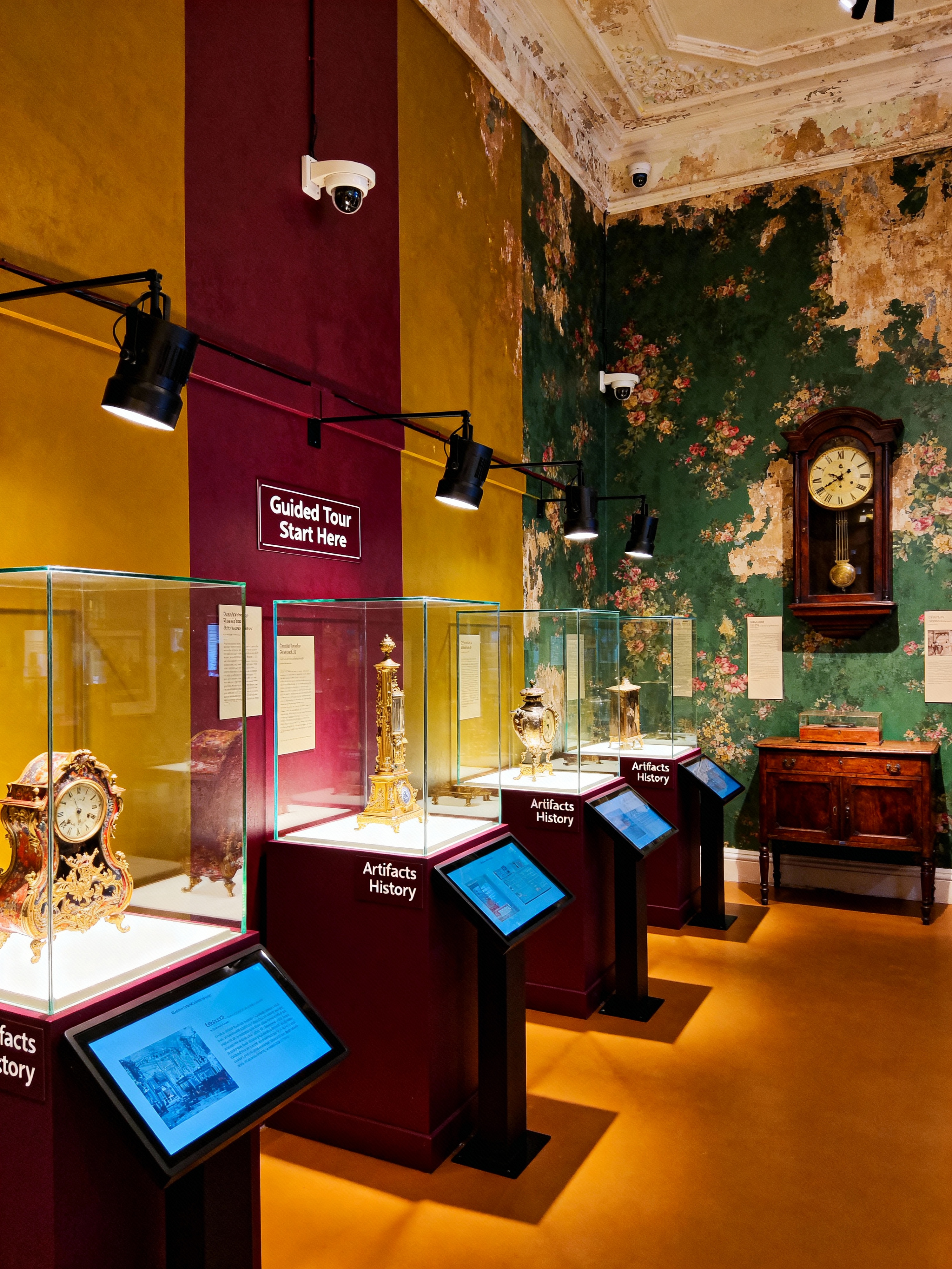 museum hall with vintage style with spotlights and interactive displays and artifacts and guided tour signs and pedestals and security cameras and display cases and information plaques. . with bold patterns and retro style and ornate details and colorful accents and eclectic and shabby chic and antique decor and timeless pieces