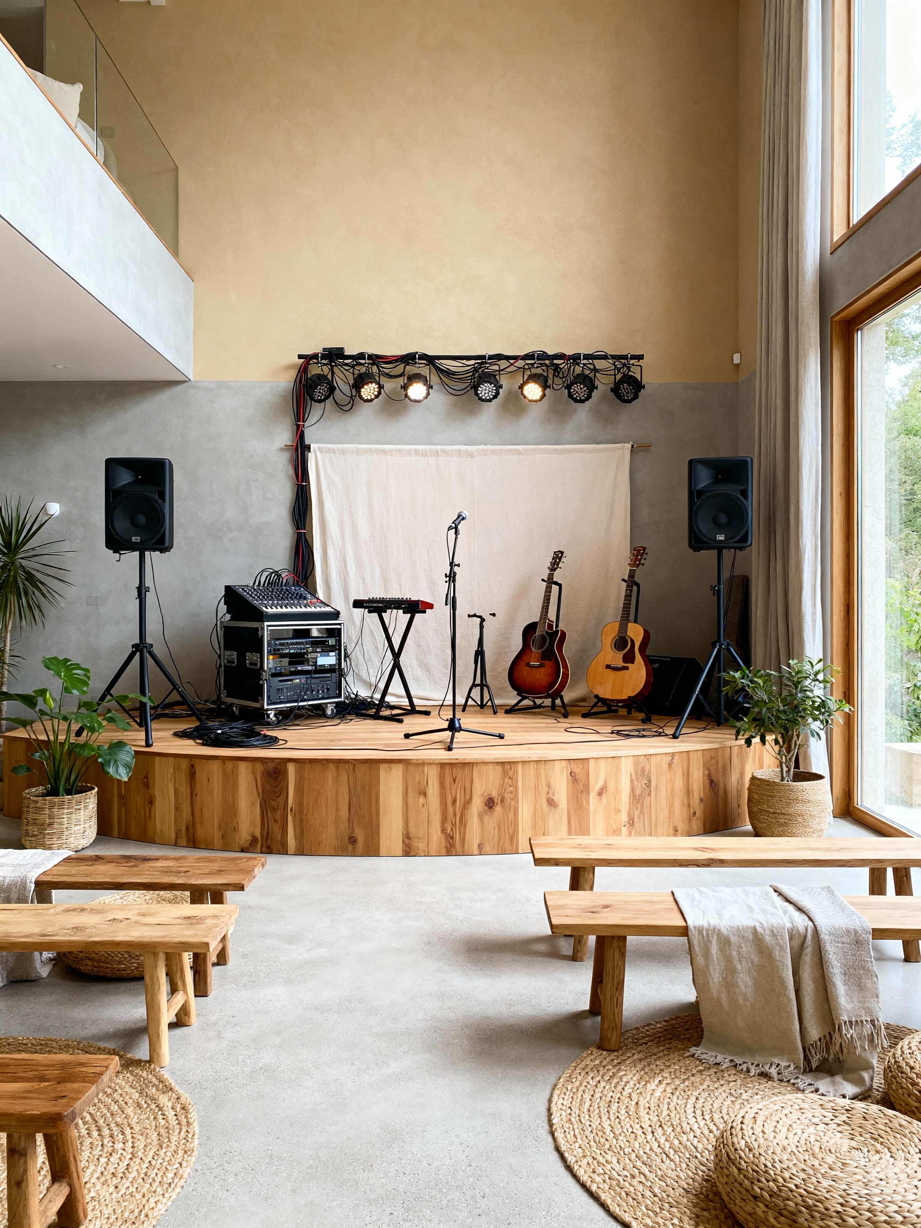 music stage with airbnb style with cables and stage lights and microphones and sound mixing board and stage monitors and musical instruments and backdrop and guitar stands. . with natural materials and elements and scandinavian style and open and natural lighting and neutral walls and textures and simple, clean lines and simplistic furniture and practicality and functionality and simple color palette and natural materials and elements