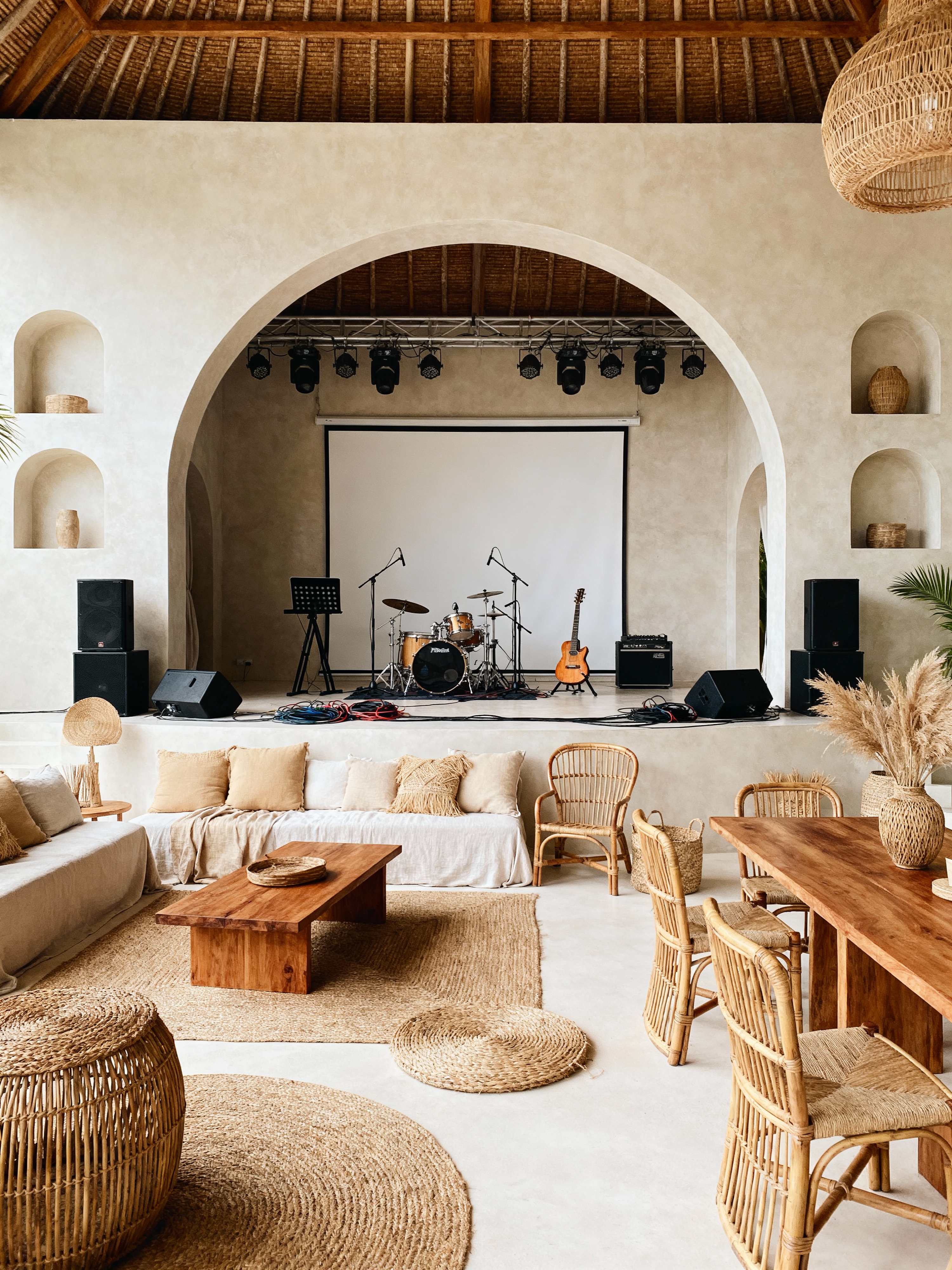 music stage with bali style with musical instruments and cables and drum kit and guitar stands and stage lights and backdrop and stage monitors and amplifiers. . with beige and sand tone cushions and calm, minimal, tropical atmosphere and rattan chairs and decor and arched walls and niches and wooden coffee and dining tables and raffia or bamboo accents and woven rugs (jute, seagrass) and linen or cotton fabrics