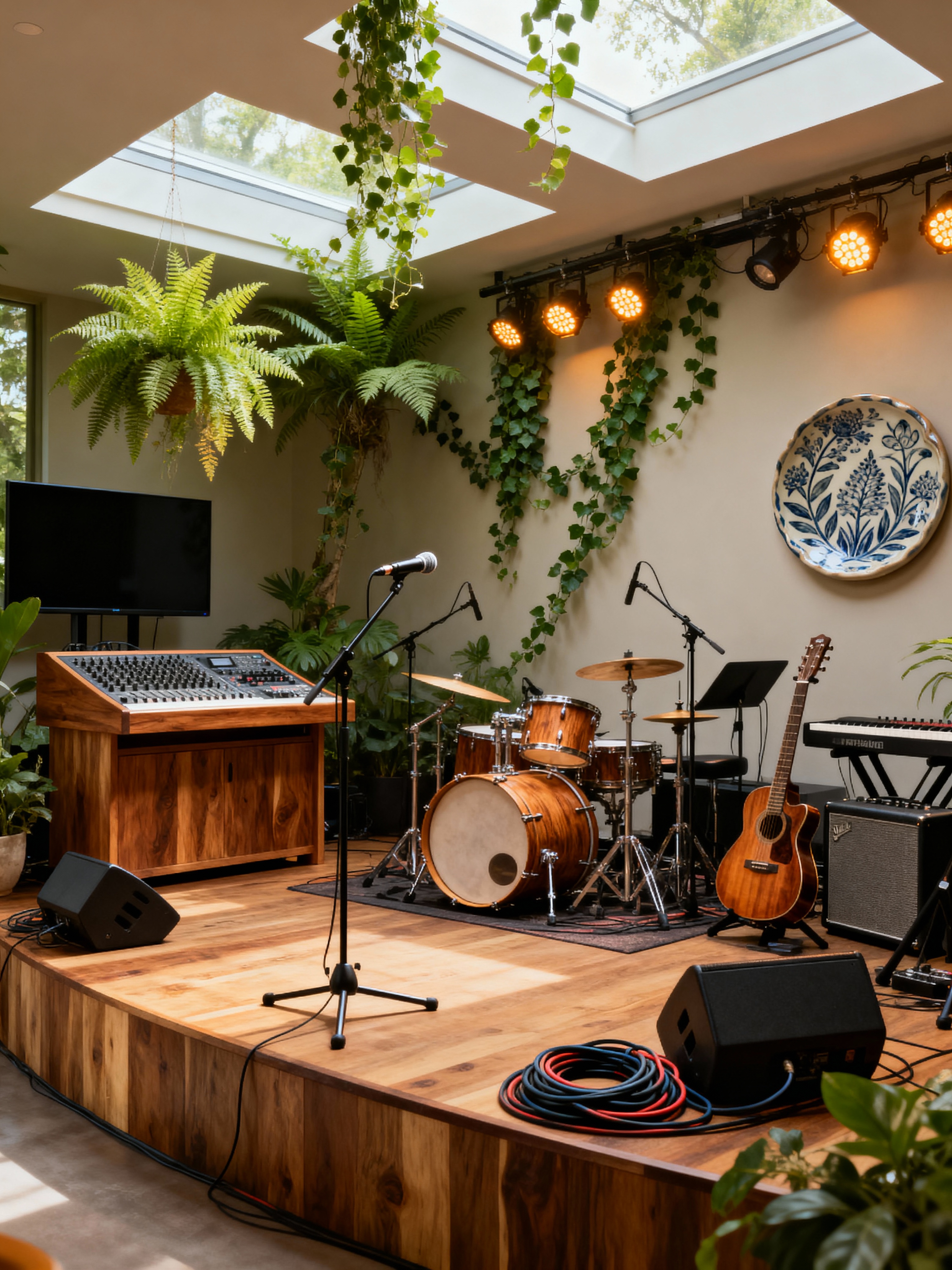 music stage with biophilic style with microphones and drum kit and sound mixing board and stage monitors and stage lights and cables and musical instruments and amplifiers. . with wood materials and features of nature and sunlight and plants and ceramic materials and images of nature and plants and features of the natural world