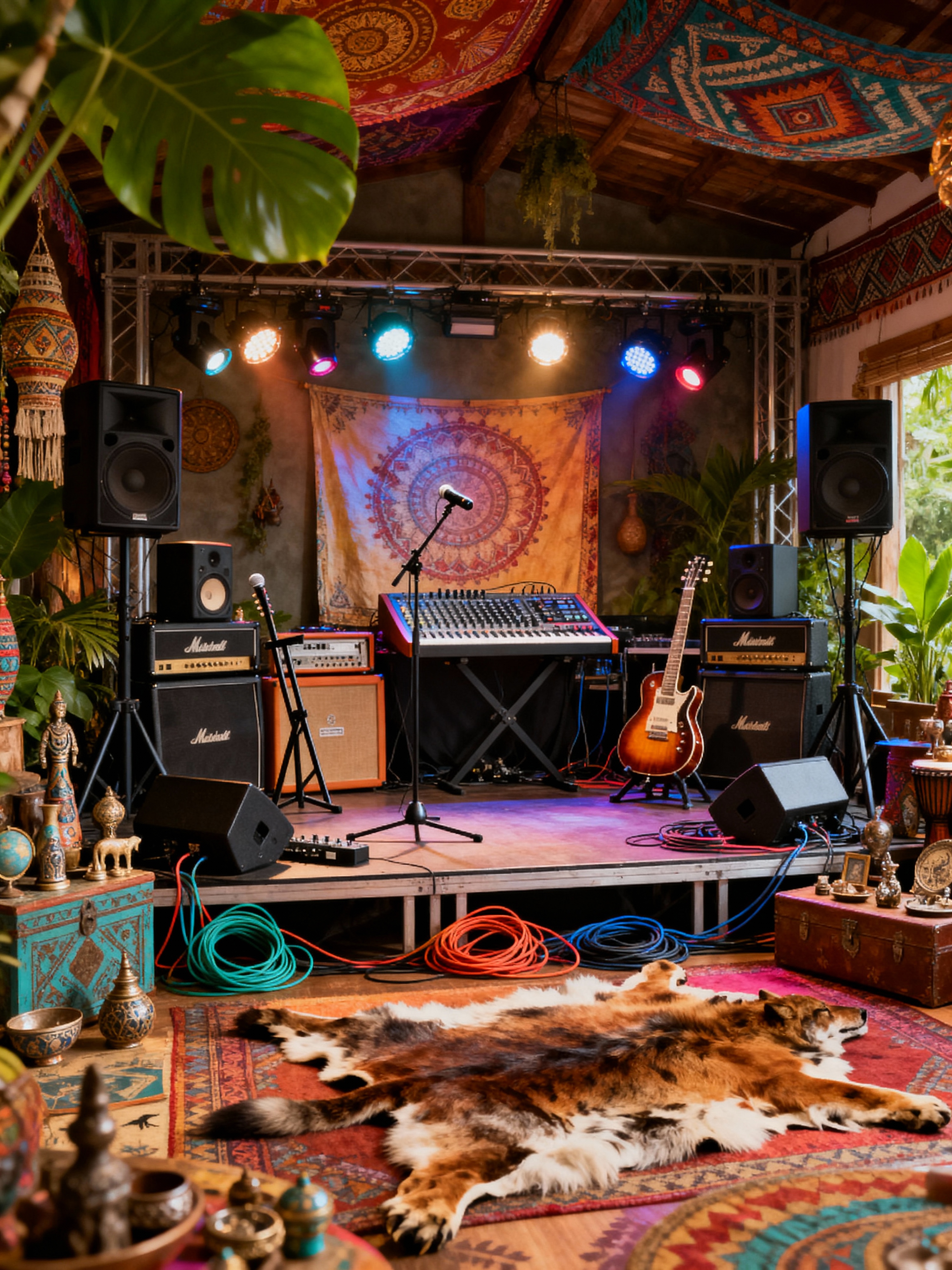 music stage with bohemian style with amplifiers and stage lights and backdrop and sound mixing board and guitar stands and microphones and stage monitors and cables. . with animal hides and carefree layers of pattern, texture, and color and a lack of structure and travel trinkets and bold colors and bold patterns and lush green nature and mixed patterns
