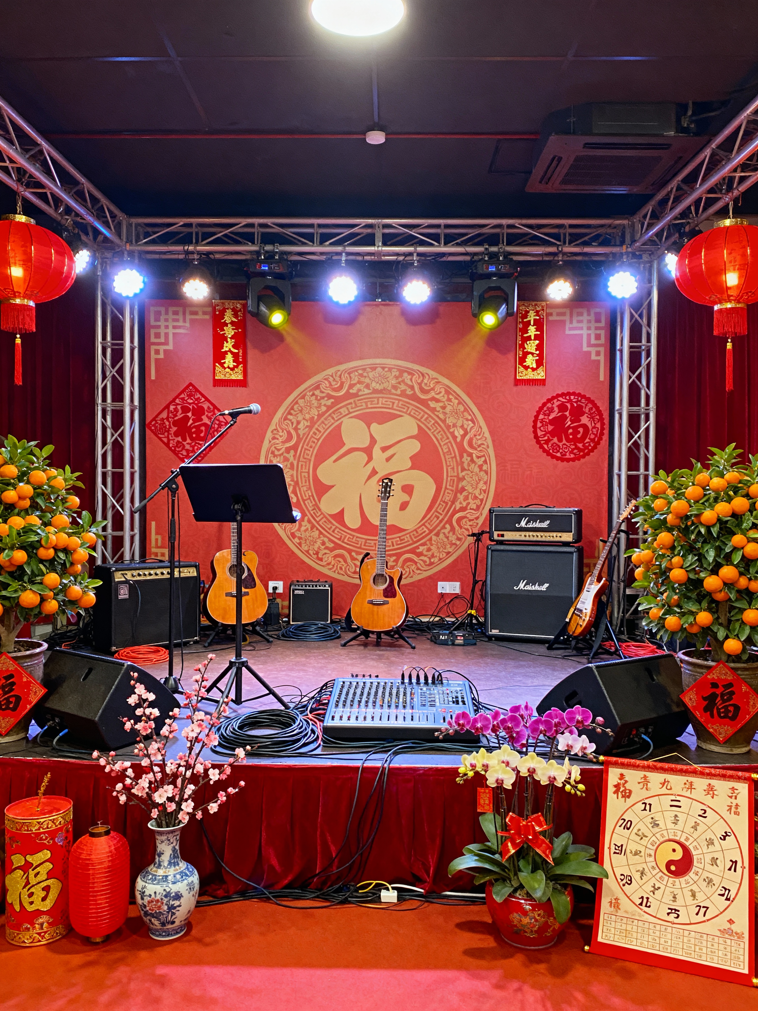 music stage with chinese new year style with guitar stands and stage monitors and amplifiers and stage lights and backdrop and cables and sound mixing board and musical instruments. . with orange trees and fai chun banners and paper cuttings and kumquat trees and vases of plum blossoms and orchids and chinese red lanterns and mei hwa flowers and zodiac calendar