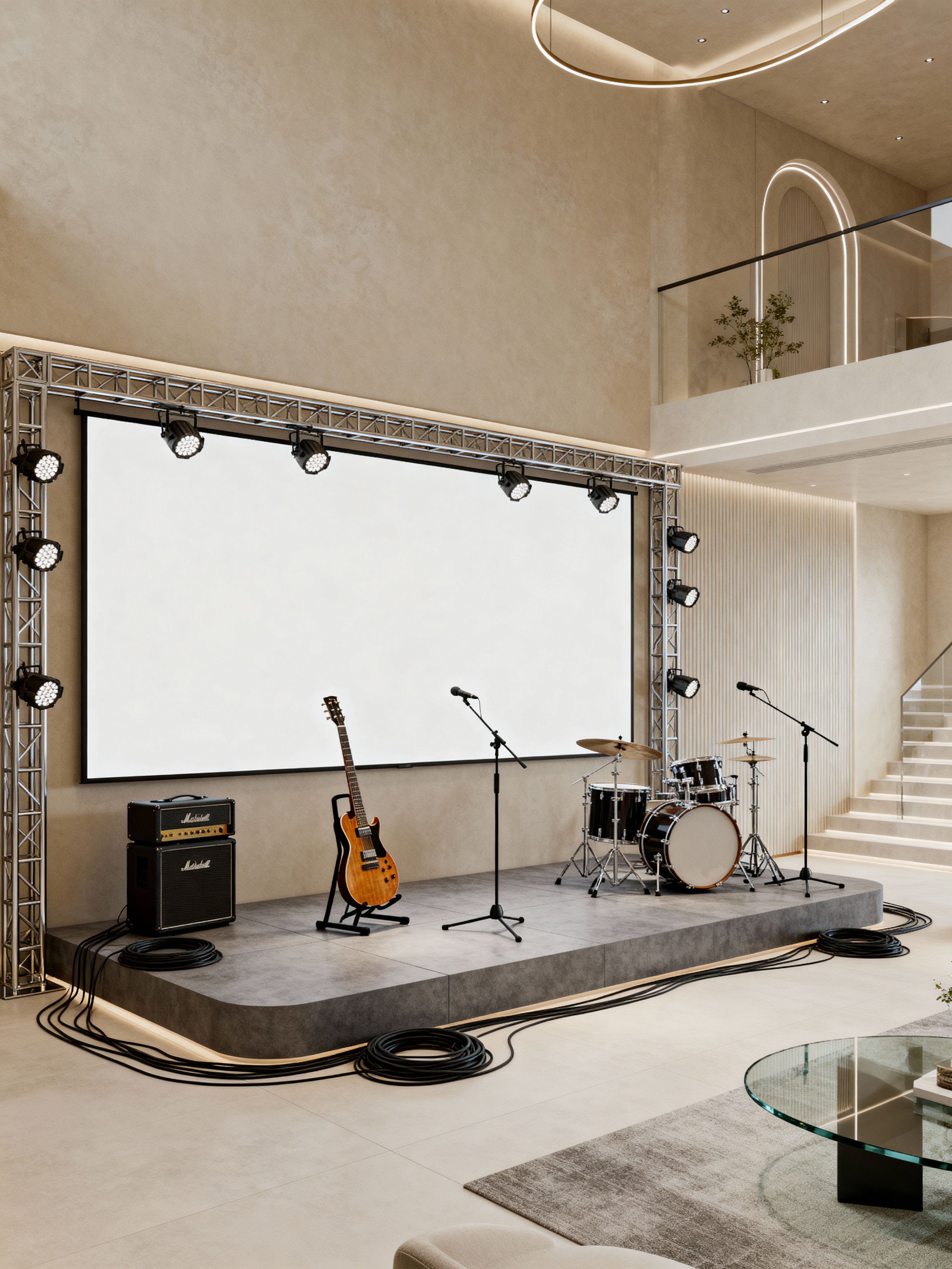 music stage with contemporary style with stage monitors and backdrop and guitar stands and stage lights and amplifiers and microphones and cables and drum kit. . with minimalist and elegant simplicity and sleek lines and functional design and metal accents and glass decor and open spaces and neutral palette