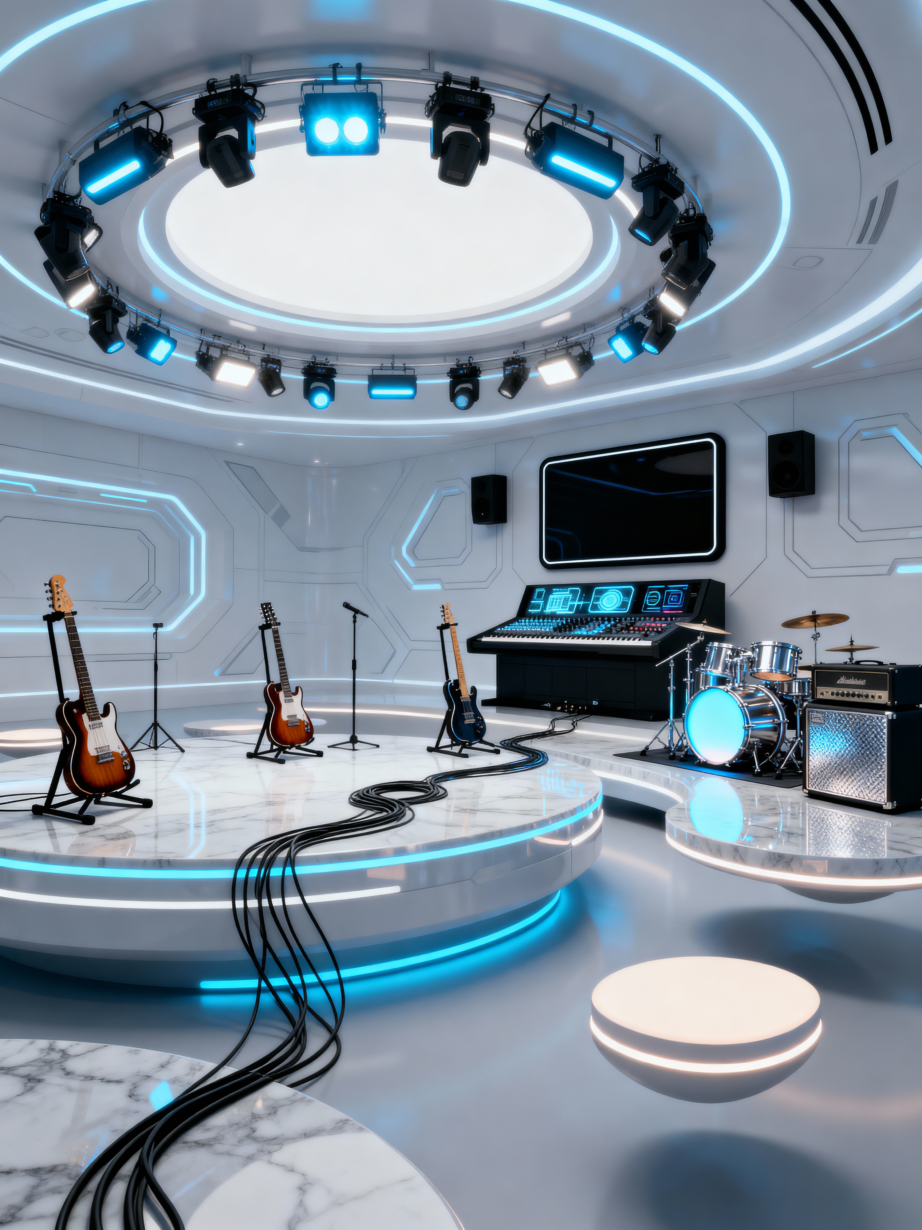 music stage with futuristic style with guitar stands and musical instruments and cables and stage lights and stage monitors and sound mixing board and amplifiers and drum kit. . with floating surfaces and futuristic interior and spaceship interior and circular shapes and smooth polished marble and futurism and futurism minimalist interior and steel finishing