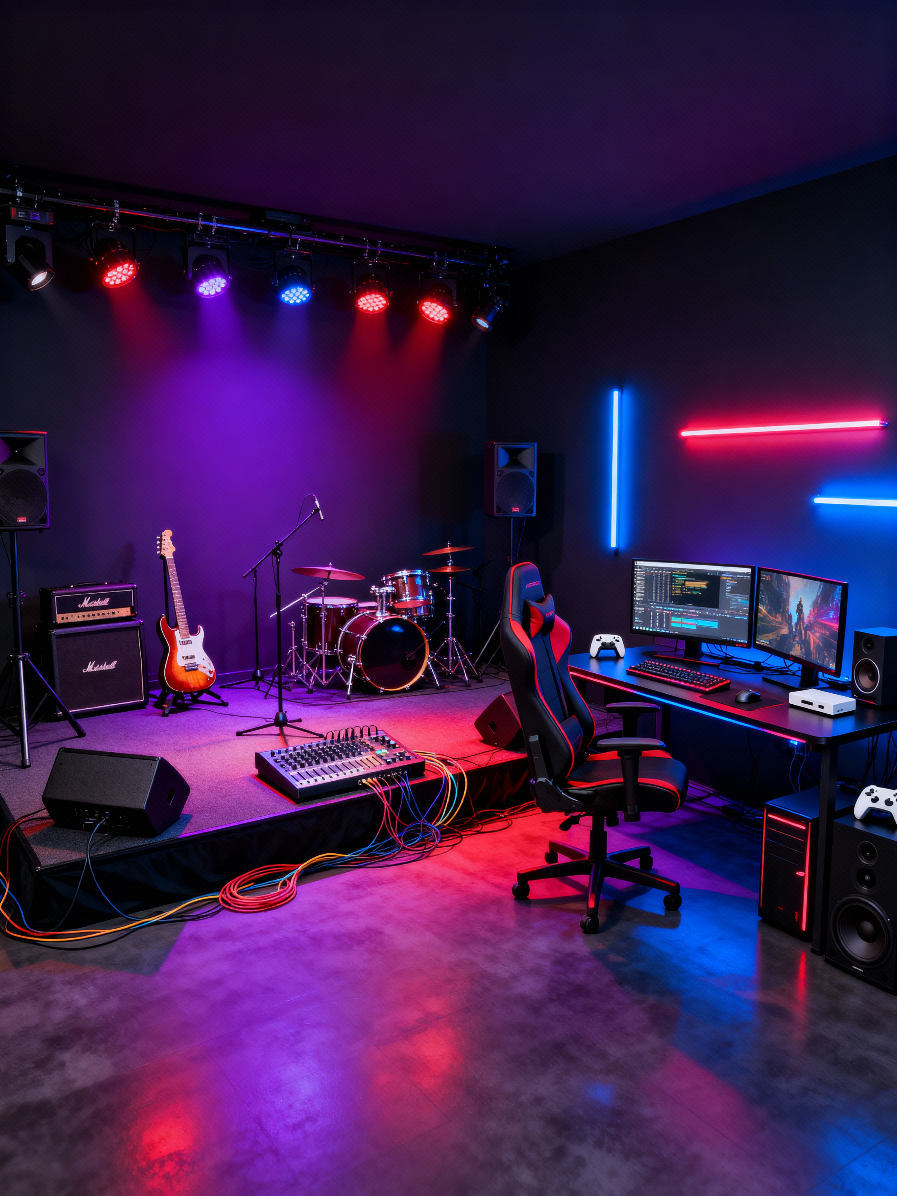 music stage with gaming room style with guitar stands and backdrop and amplifiers and stage lights and sound mixing board and drum kit and stage monitors and cables. . with computer desk with computer displays and keyboard and multiple displays and dark walls and purple, red and blue fade light and gaming chair and video game consoles and neon lights and speakers