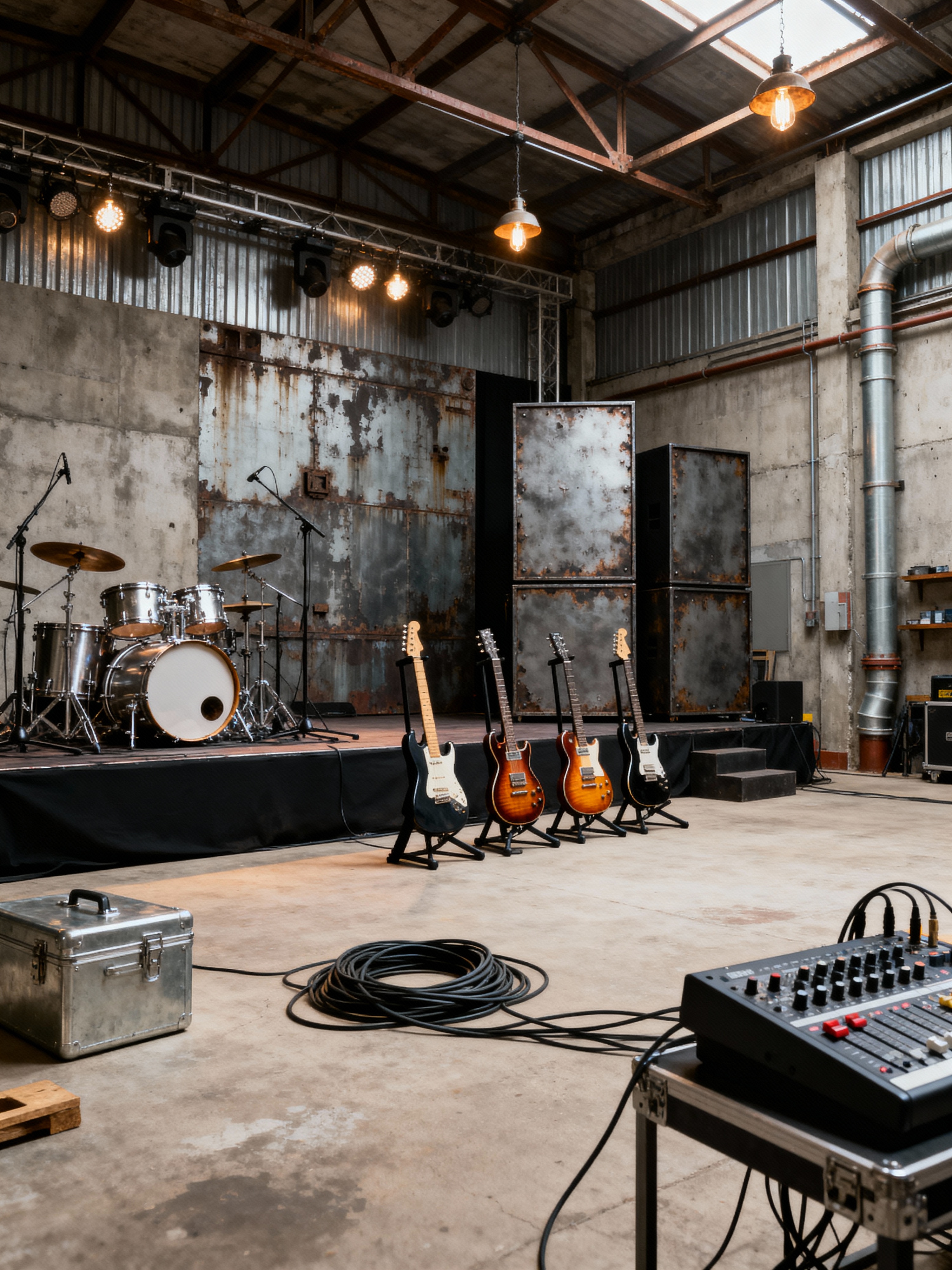 music stage with industrial style with musical instruments and guitar stands and cables and backdrop and stage monitors and stage lights and sound mixing board and drum kit. . with utilitarian objects and exposed rafters and raw aesthetic and exposed concrete and factory style and neutral tones and open floorplan and metal panels