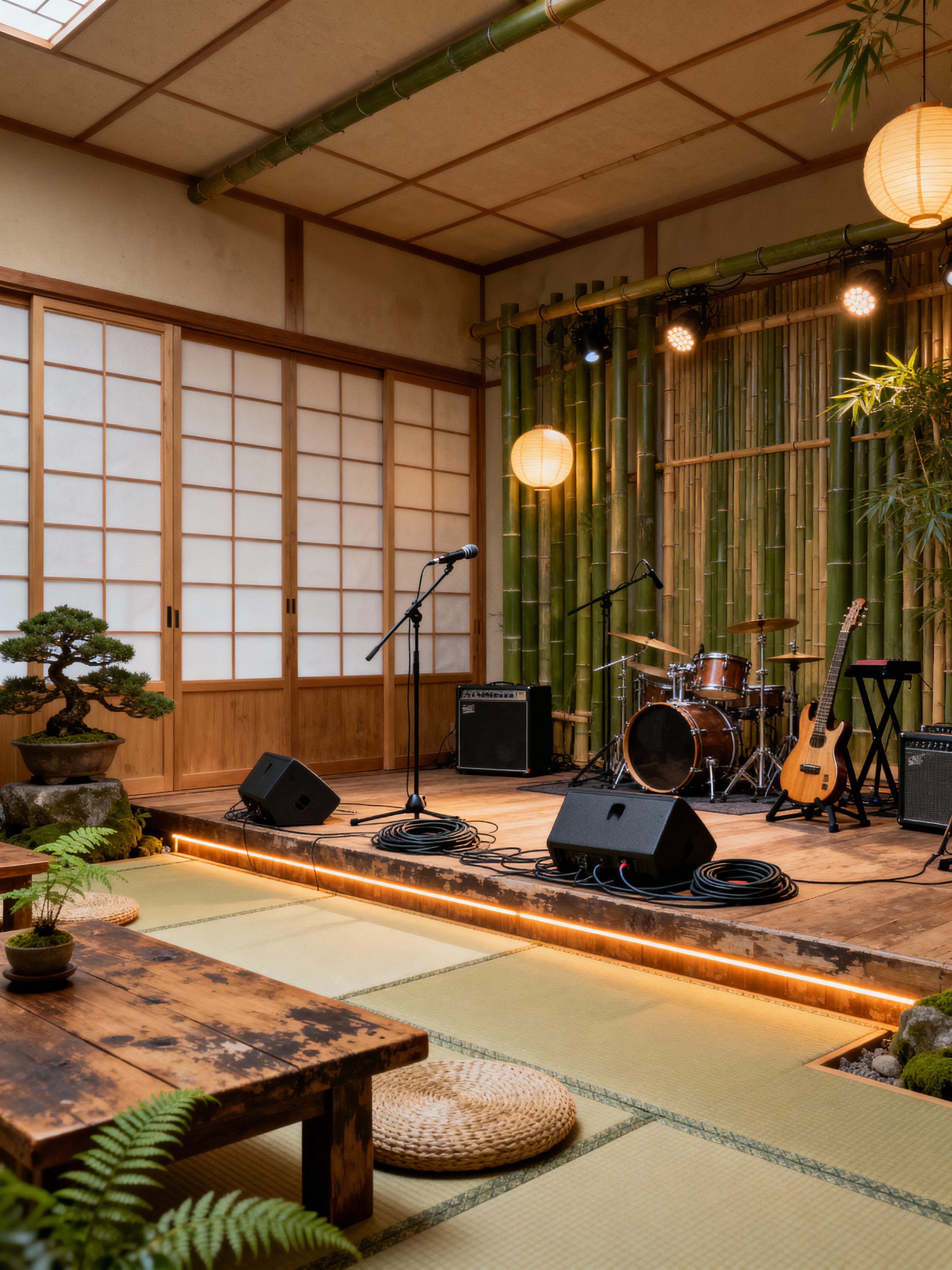 music stage with japanese design style with microphones and stage monitors and cables and stage lights and amplifiers and drum kit and guitar stands and musical instruments. . with sliding doors and tatami mats and low furniture and natural materials and wabi-sabi and bamboo accents and indoor plants and tranquility