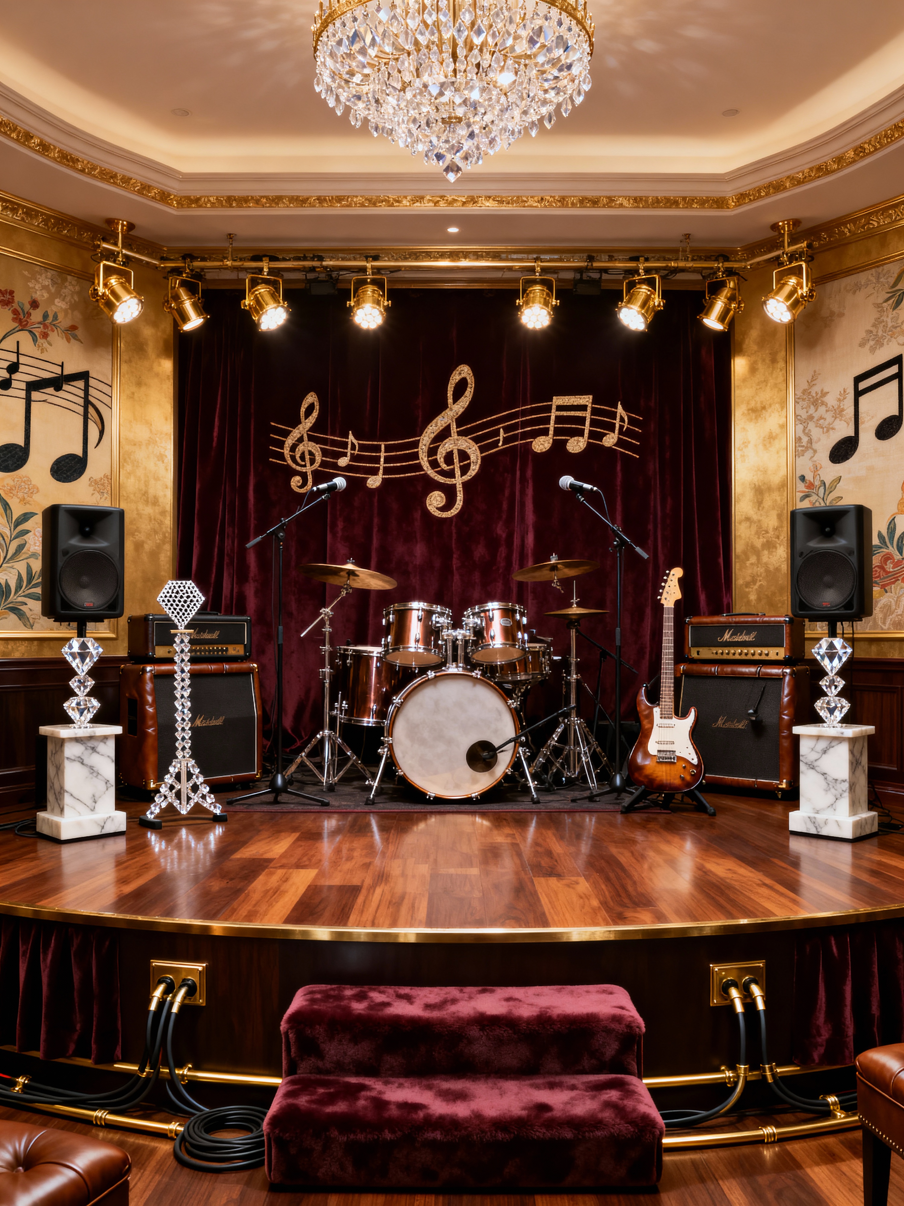 music stage with luxury style with drum kit and amplifiers and guitar stands and stage lights and backdrop and stage monitors and microphones and cables. . with sophisticated style and custom pieces and high-end materials and exclusive design and lavish comfort and premium finishes and expensive fabrics and opulent details