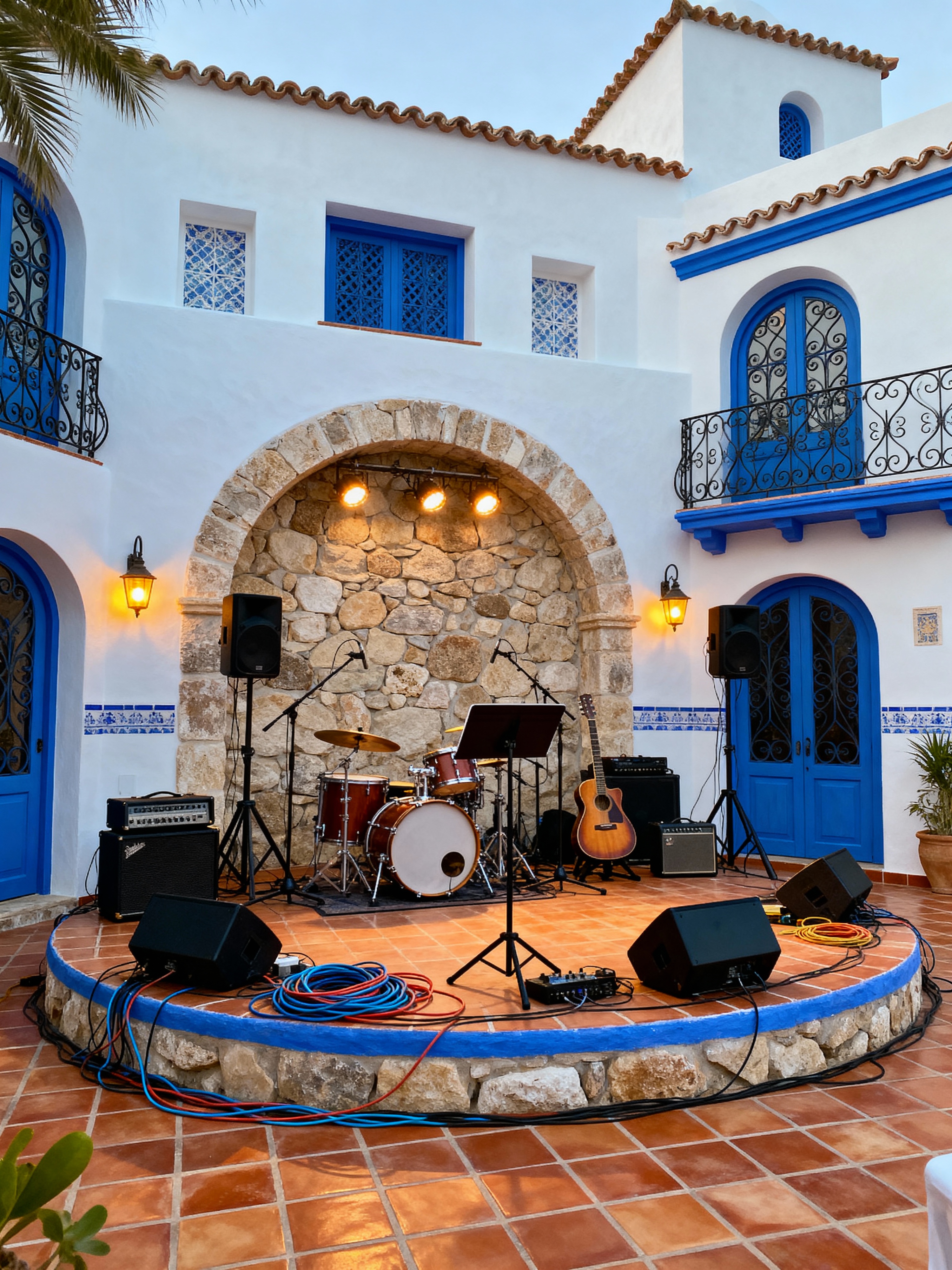 music stage with mediterranean style with drum kit and amplifiers and cables and guitar stands and stage monitors and musical instruments and backdrop and stage lights. . with stone accents and arched doorways and blue and white and rustic charm and warm earth tones and wrought iron and coastal influence and terracotta tiles