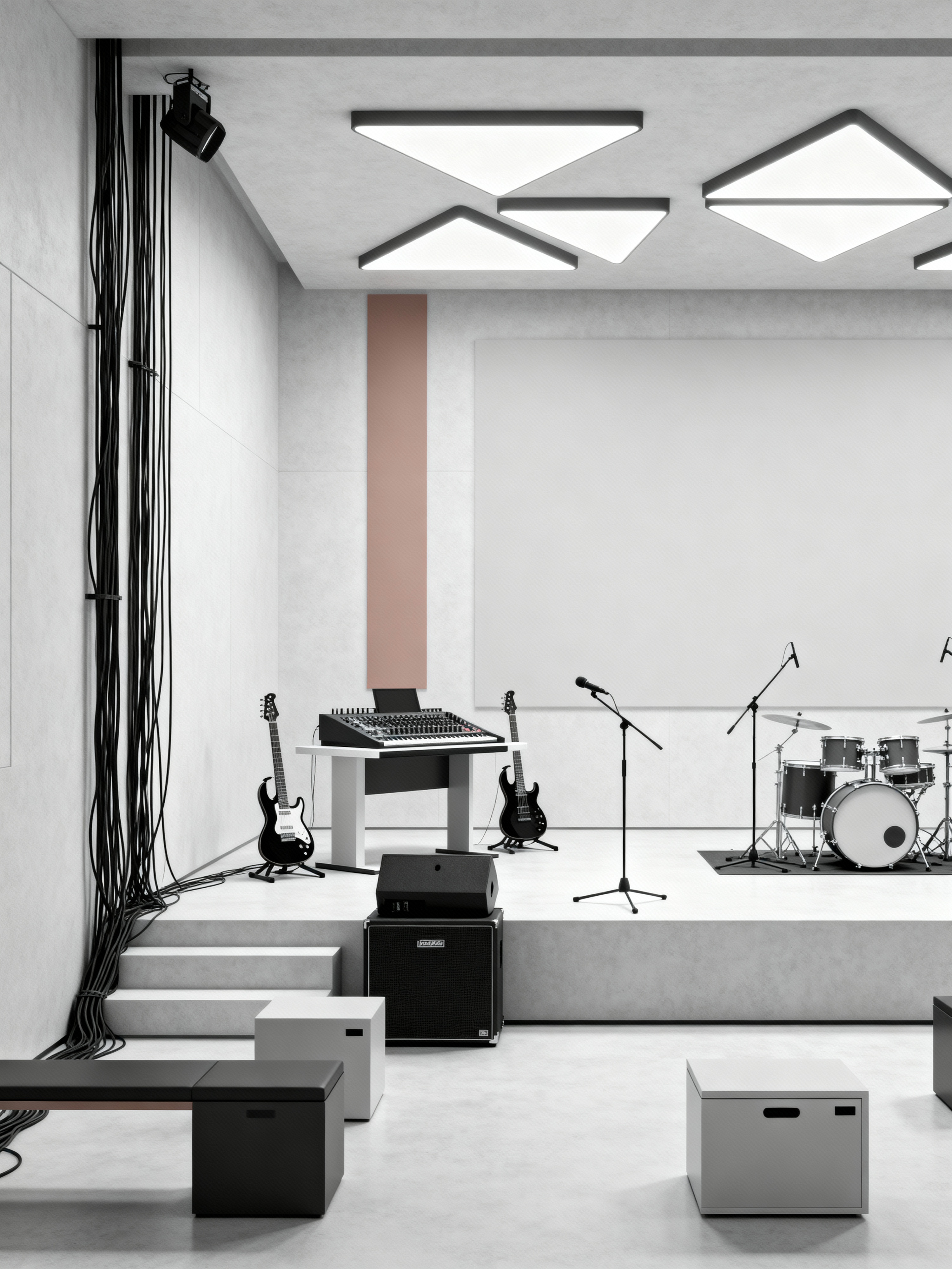 music stage with minimalist style with cables and musical instruments and sound mixing board and drum kit and stage lights and backdrop and amplifiers and microphones. . with functional furniture and a monochromatic palette with colour used as an accent and focus on the shape, colour and texture of just a few of essential elements and clean lines and lots of light and an open floor plan and functional furniture