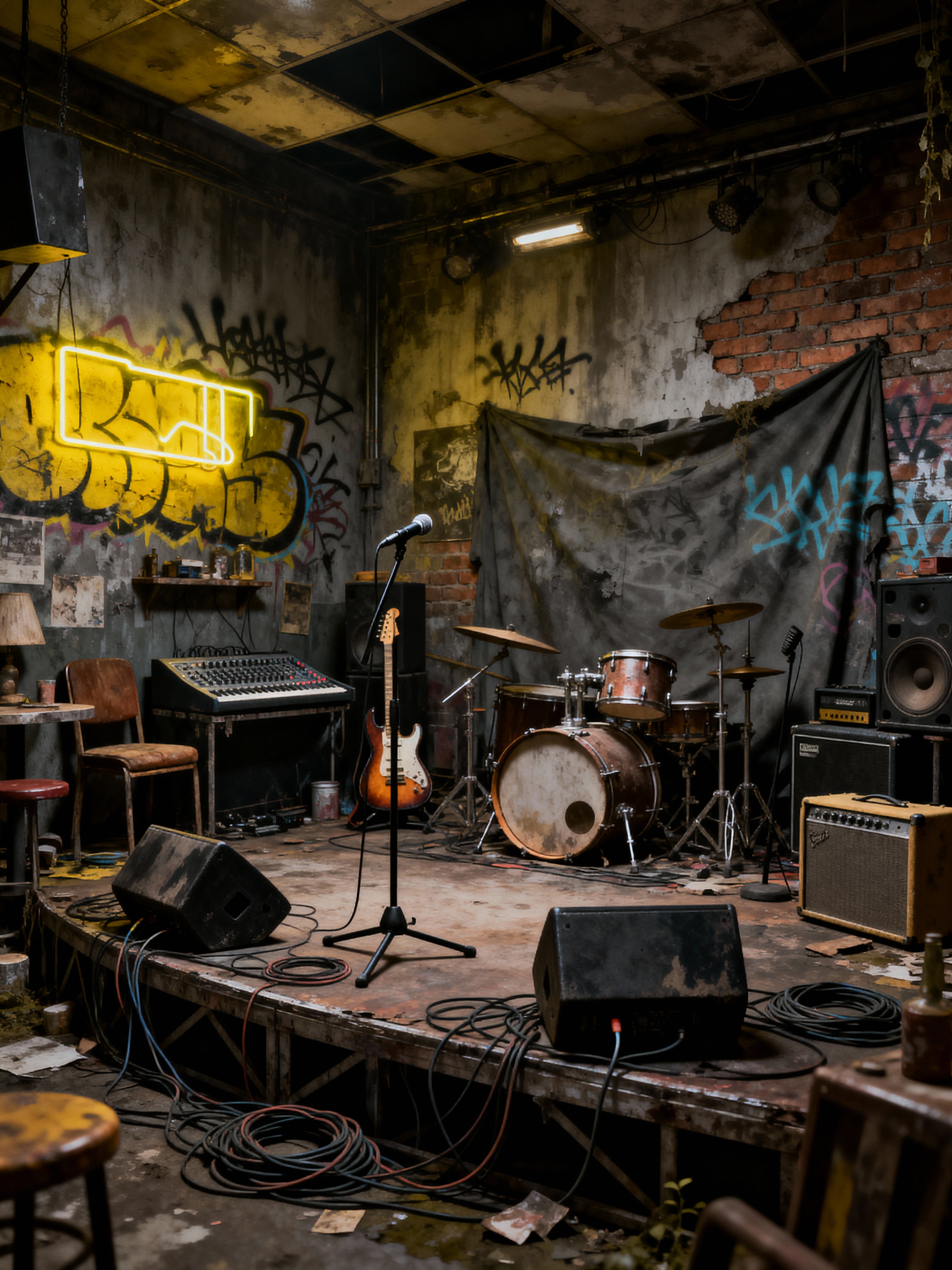 music stage with post-apocalyptic style with stage monitors and guitar stands and sound mixing board and microphones and cables and drum kit and backdrop and amplifiers. . with desolate and poverty-stricken and dim lighting and graffiti on walls and exposed bricks and cheap mismatched furniture and scavenged decor and survival-inspired