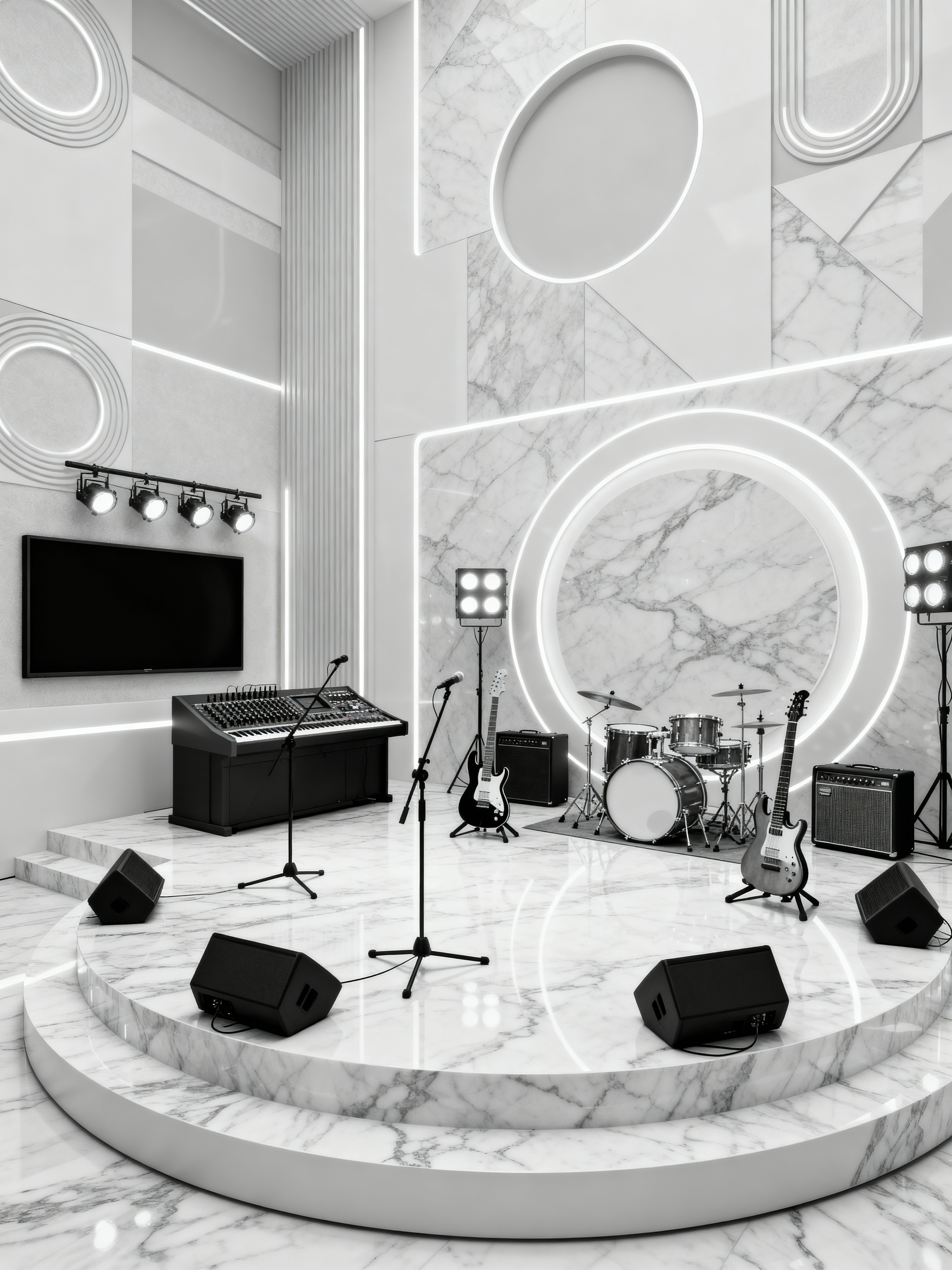 music stage with retro futuristic style with stage monitors and sound mixing board and stage lights and guitar stands and musical instruments and backdrop and amplifiers and drum kit. . with futurism minimalist interior and smooth marble and strong geometric walls and circular shapes and neutral background and bright accents and minimalist clean lines and monochromatic palette and smooth polished marble