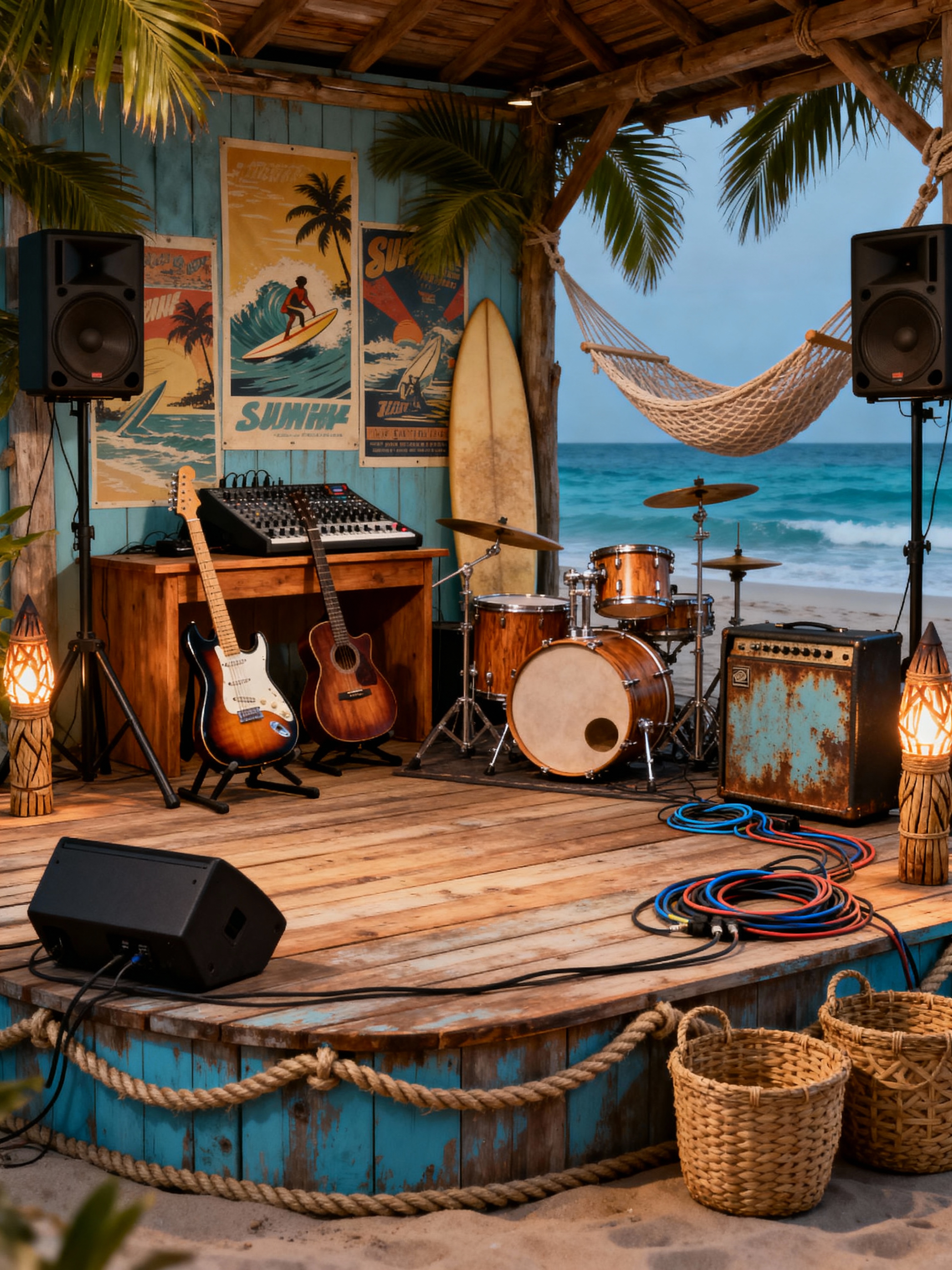 music stage with surf shack style with guitar stands and stage monitors and sound mixing board and drum kit and cables and amplifiers and musical instruments and backdrop. . with palm fronds and vintage surf posters and relaxed atmosphere and rope details and hammocks and weathered wood and woven baskets and tiki torches
