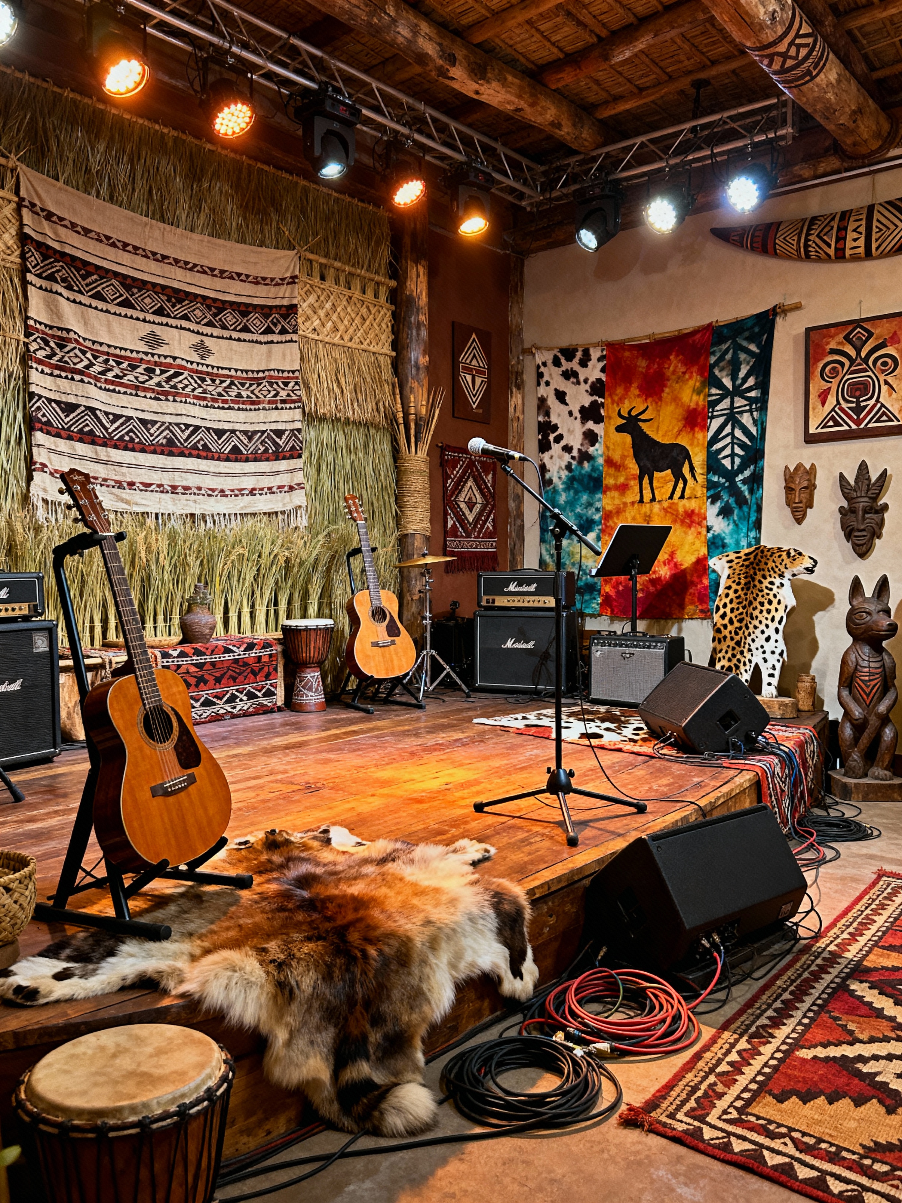 music stage with tribal style with guitar stands and musical instruments and backdrop and stage monitors and amplifiers and stage lights and microphones and cables. . with tribal revival and animal furslinen and intricate grass weaving and smooth worn timbers and hand dyed batik fabrics and animal prints and sculptures and artworks and tribal patterns