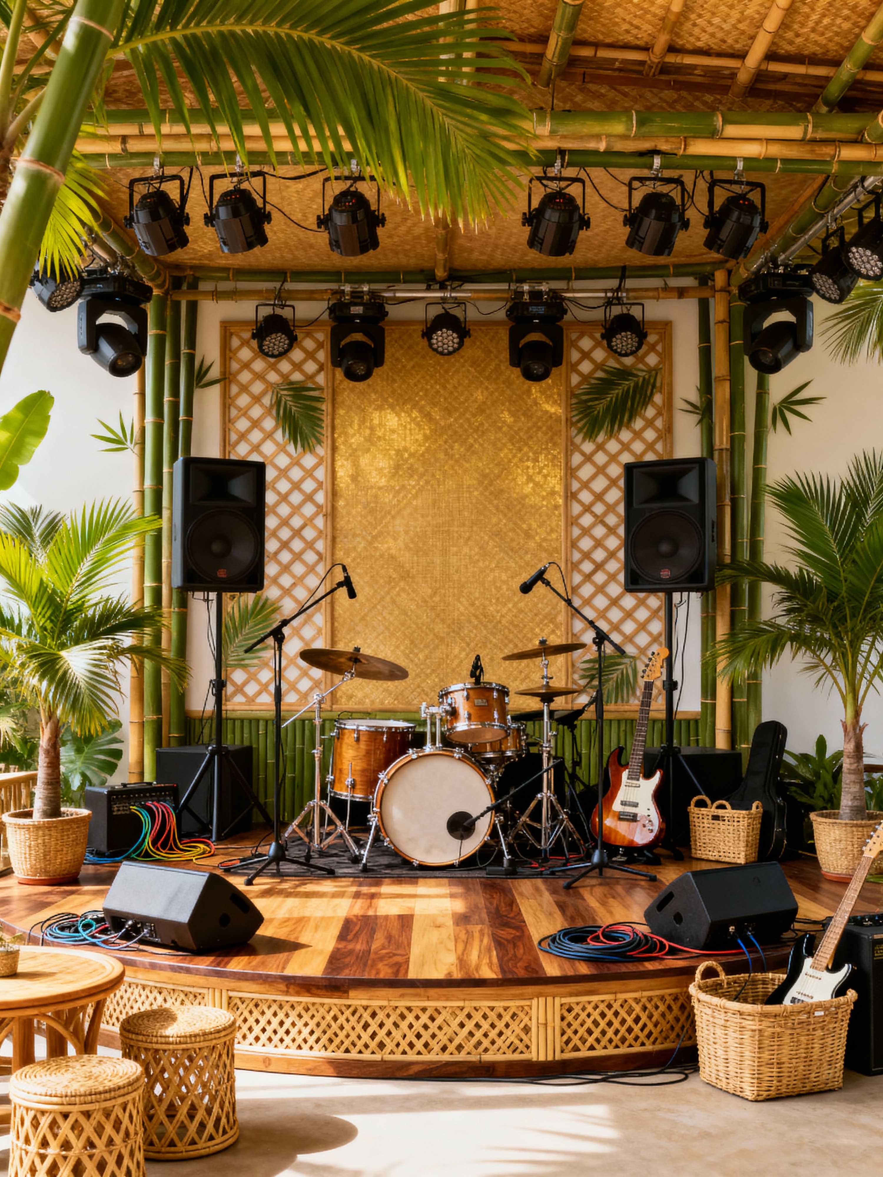 music stage with tropical style with drum kit and stage monitors and musical instruments and microphones and cables and stage lights and backdrop and amplifiers. . with rattan and palm leaves and bamboo and palm trees and lattice prints and teak and cane motifs and wicker