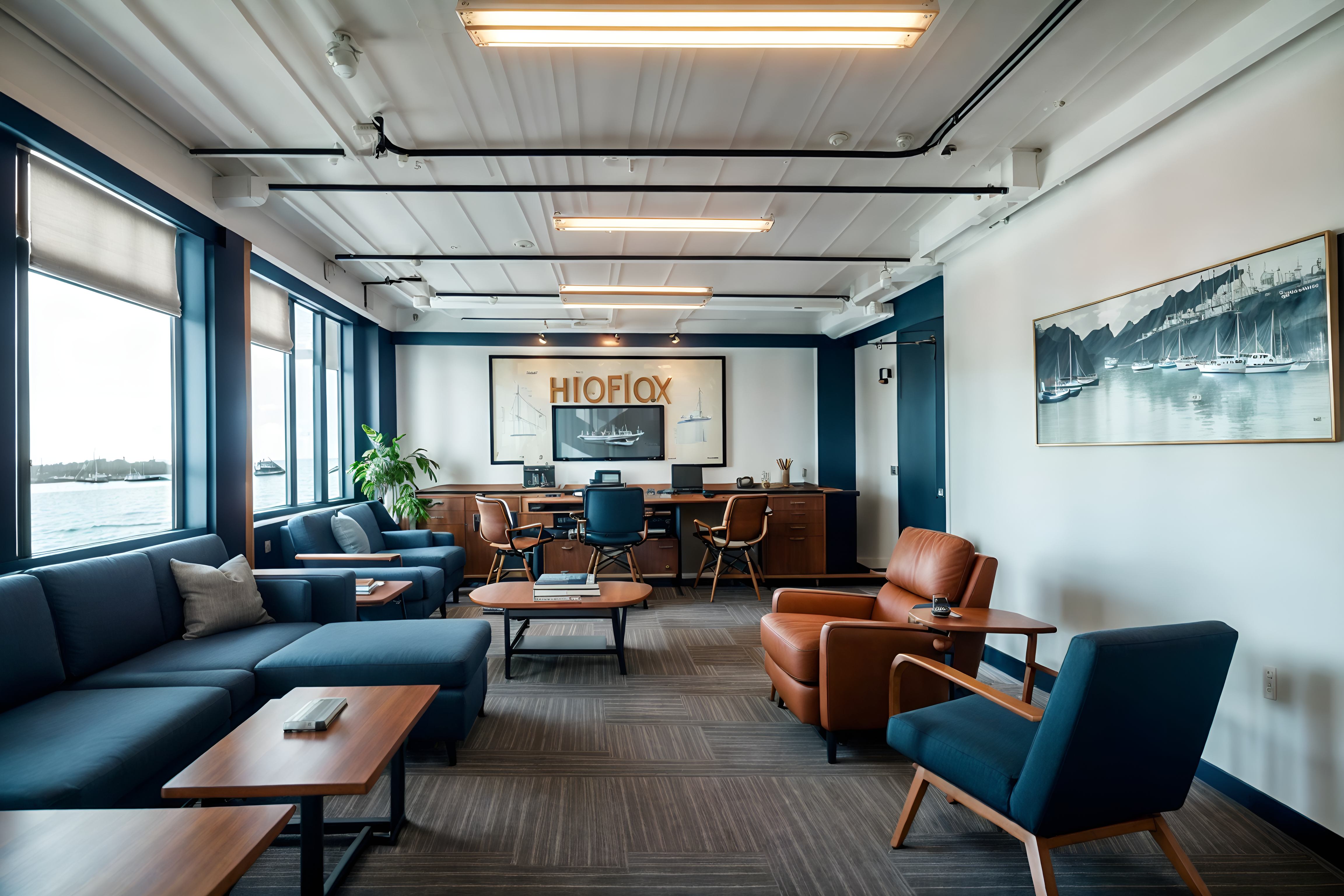 photo from pinterest of nautical-style interior designed (coworking space interior) with office desks and office chairs and lounge chairs and seating area with sofa and office desks cinematic photo, highly detailed, cinematic lighting, ultra-detailed, ultrarealistic, photorealism, 8k. trending on pinterest. nautical interior design style. masterpiece, cinematic light, ultrarealistic+, photorealistic+, 8k, raw photo, realistic, sharp focus on eyes, (symmetrical eyes), (intact eyes), hyperrealistic, highest quality, best quality, , highly detailed, masterpiece, best quality, extremely detailed 8k wallpaper, masterpiece, best quality, ultra-detailed, best shadow, detailed background, detailed face, detailed eyes, high contrast, best illumination, detailed face, dulux, caustic, dynamic angle, detailed glow. dramatic lighting. highly detailed, insanely detailed hair, symmetrical, intricate details, professionally retouched, 8k high definition. strong bokeh. award winning photo.