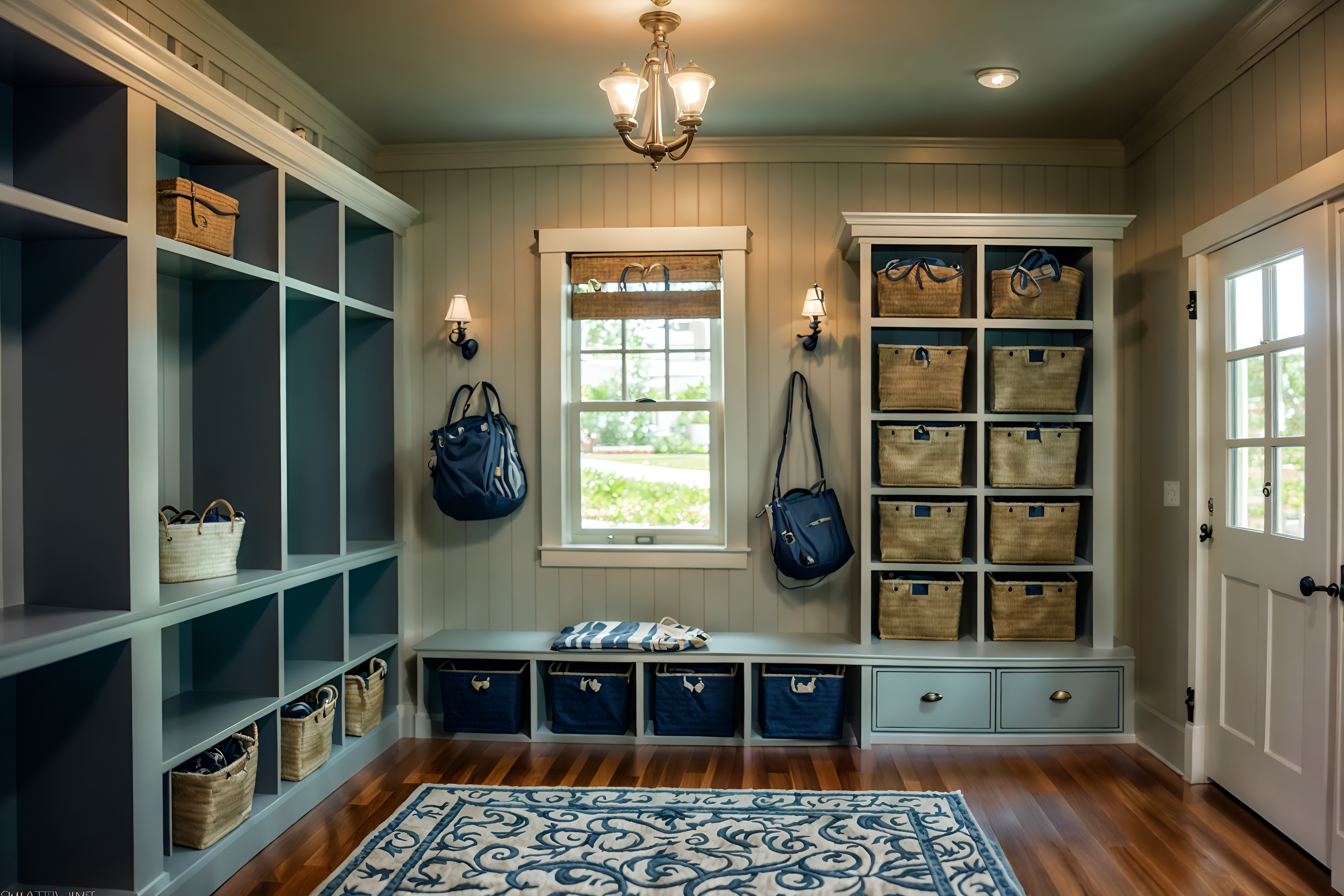 photo from pinterest of nautical-style interior designed (mudroom interior) with storage drawers and cubbies and wall hooks for coats and a bench and storage baskets and cabinets and shelves for shoes and high up storage cinematic photo, highly detailed, cinematic lighting, ultra-detailed, ultrarealistic, photorealism, 8k. trending on pinterest. nautical interior design style. masterpiece, cinematic light, ultrarealistic+, photorealistic+, 8k, raw photo, realistic, sharp focus on eyes, (symmetrical eyes), (intact eyes), hyperrealistic, highest quality, best quality, , highly detailed, masterpiece, best quality, extremely detailed 8k wallpaper, masterpiece, best quality, ultra-detailed, best shadow, detailed background, detailed face, detailed eyes, high contrast, best illumination, detailed face, dulux, caustic, dynamic angle, detailed glow. dramatic lighting. highly detailed, insanely detailed hair, symmetrical, intricate details, professionally retouched, 8k high definition. strong bokeh. award winning photo.