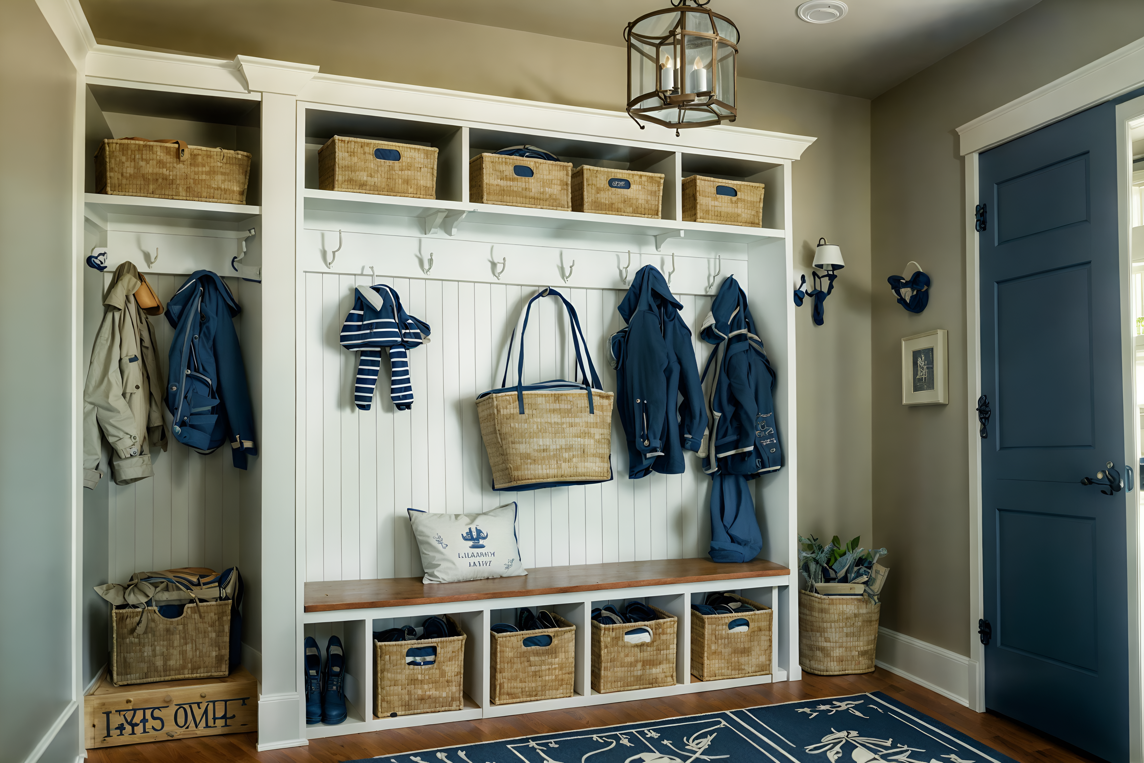 photo from pinterest of nautical-style interior designed (mudroom interior) with storage drawers and cubbies and wall hooks for coats and a bench and storage baskets and cabinets and shelves for shoes and high up storage cinematic photo, highly detailed, cinematic lighting, ultra-detailed, ultrarealistic, photorealism, 8k. trending on pinterest. nautical interior design style. masterpiece, cinematic light, ultrarealistic+, photorealistic+, 8k, raw photo, realistic, sharp focus on eyes, (symmetrical eyes), (intact eyes), hyperrealistic, highest quality, best quality, , highly detailed, masterpiece, best quality, extremely detailed 8k wallpaper, masterpiece, best quality, ultra-detailed, best shadow, detailed background, detailed face, detailed eyes, high contrast, best illumination, detailed face, dulux, caustic, dynamic angle, detailed glow. dramatic lighting. highly detailed, insanely detailed hair, symmetrical, intricate details, professionally retouched, 8k high definition. strong bokeh. award winning photo.