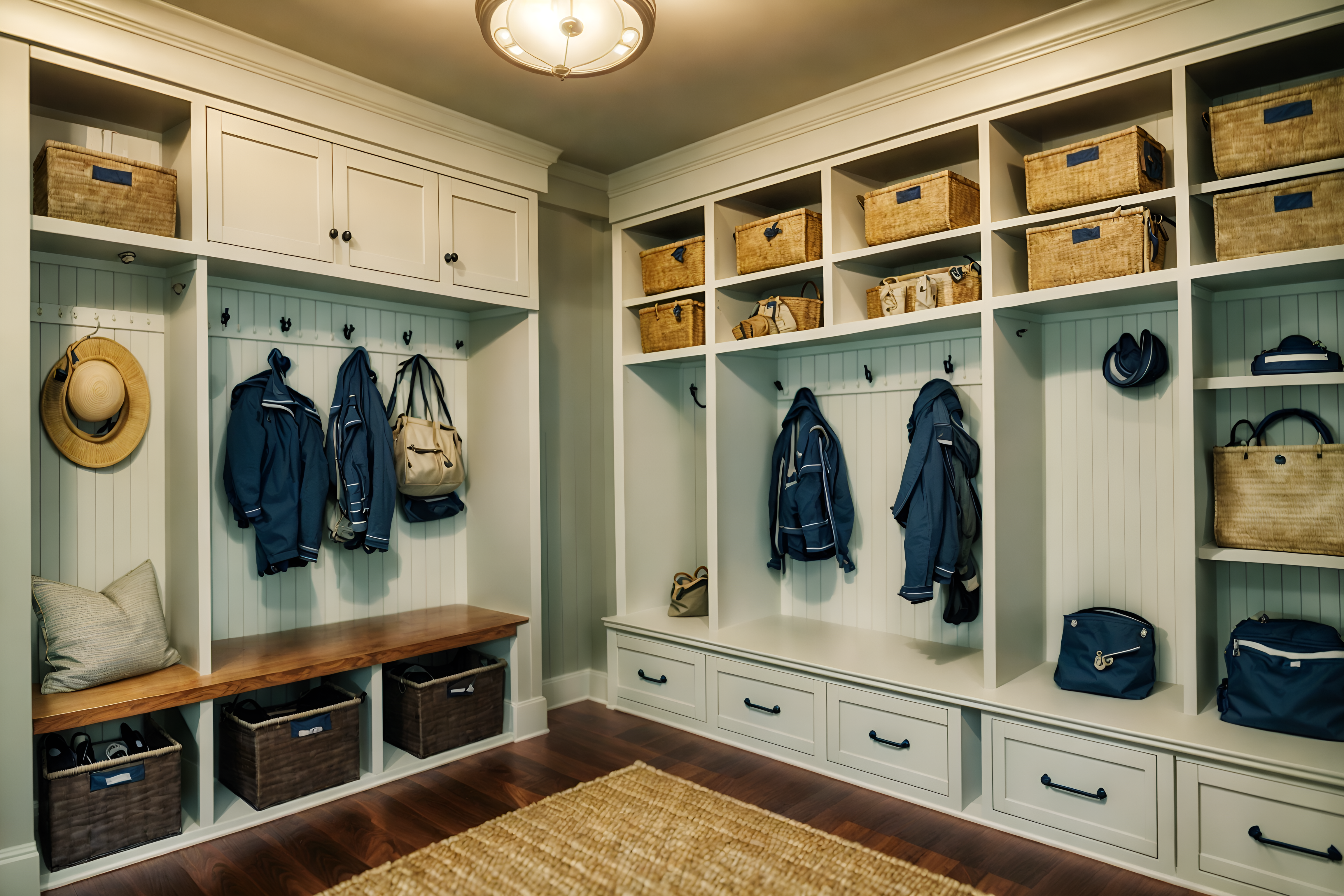 photo from pinterest of nautical-style interior designed (mudroom interior) with storage drawers and cubbies and wall hooks for coats and a bench and storage baskets and cabinets and shelves for shoes and high up storage cinematic photo, highly detailed, cinematic lighting, ultra-detailed, ultrarealistic, photorealism, 8k. trending on pinterest. nautical interior design style. masterpiece, cinematic light, ultrarealistic+, photorealistic+, 8k, raw photo, realistic, sharp focus on eyes, (symmetrical eyes), (intact eyes), hyperrealistic, highest quality, best quality, , highly detailed, masterpiece, best quality, extremely detailed 8k wallpaper, masterpiece, best quality, ultra-detailed, best shadow, detailed background, detailed face, detailed eyes, high contrast, best illumination, detailed face, dulux, caustic, dynamic angle, detailed glow. dramatic lighting. highly detailed, insanely detailed hair, symmetrical, intricate details, professionally retouched, 8k high definition. strong bokeh. award winning photo.