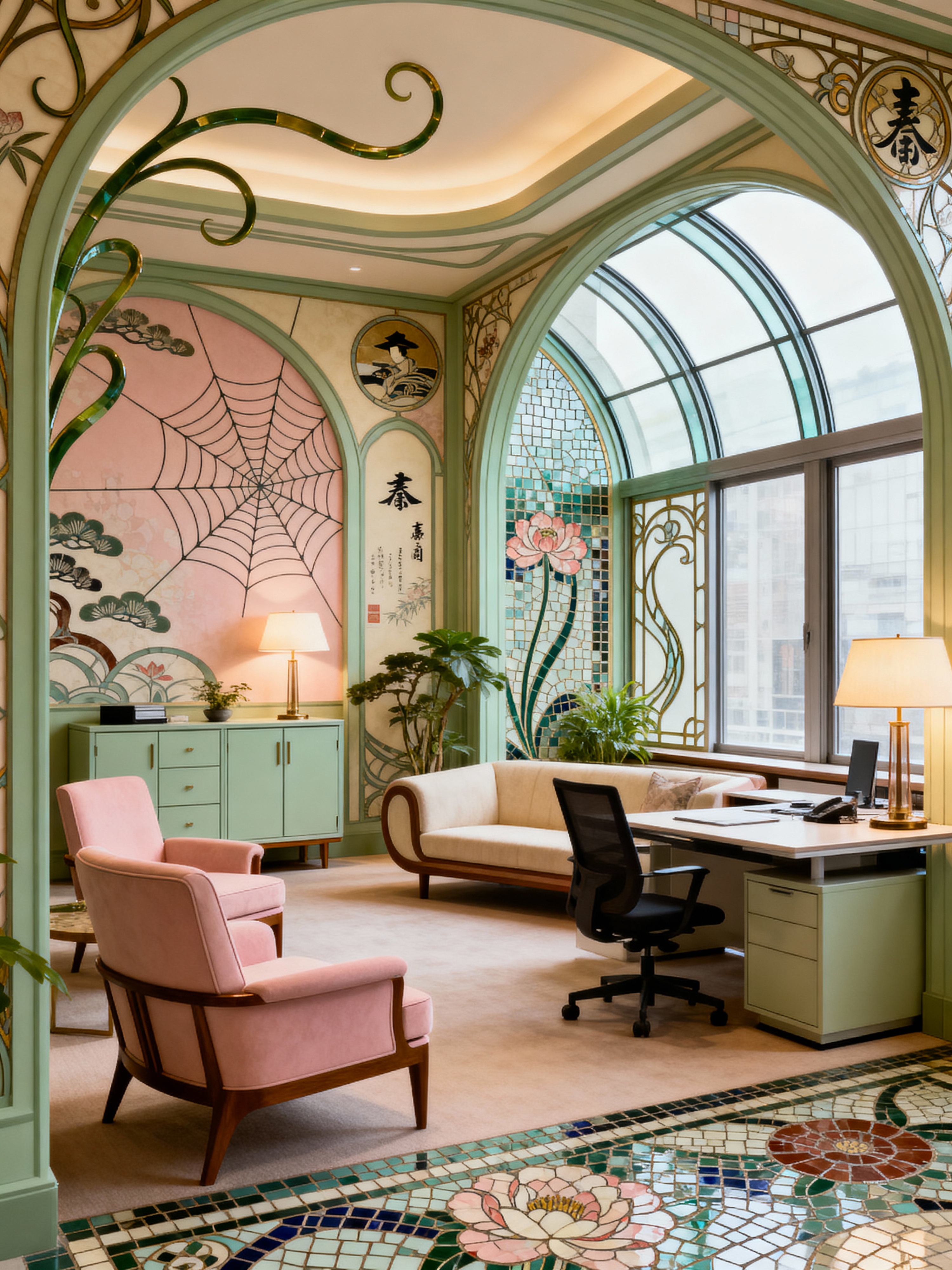 office with art nouveau style with lounge chairs and cabinets and desk lamps and windows and office chairs and seating area with sofa and plants and office desks. . with arches and curved forms and curving, plant-like embellishments and japanese motifs and wallpaper pattners of spider webs and asymmetrical shapes and mosaics and wallpaper patterns of stylized flowers and curved glass
