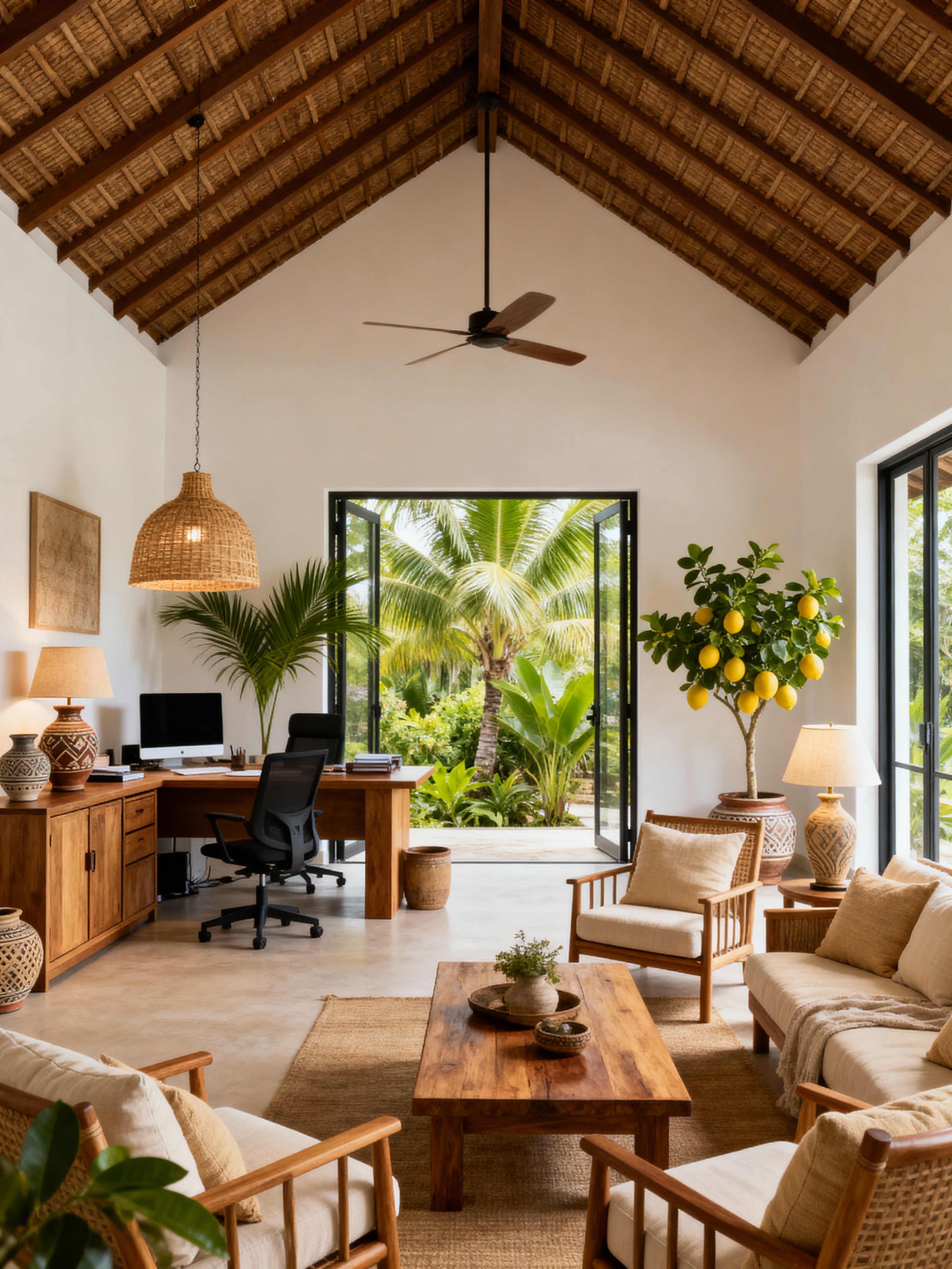 office with bali style with cabinets and plants and desk lamps and office desks and lounge chairs and windows and office chairs and computer desks. . with white or cream walls and indoor-outdoor flow with glass doors and handcrafted pottery and vases and beige and sand tone cushions and wooden coffee and dining tables and woven pendant lamps and open high ceilings with fans and lush tropical plants (palms, lemon trees)