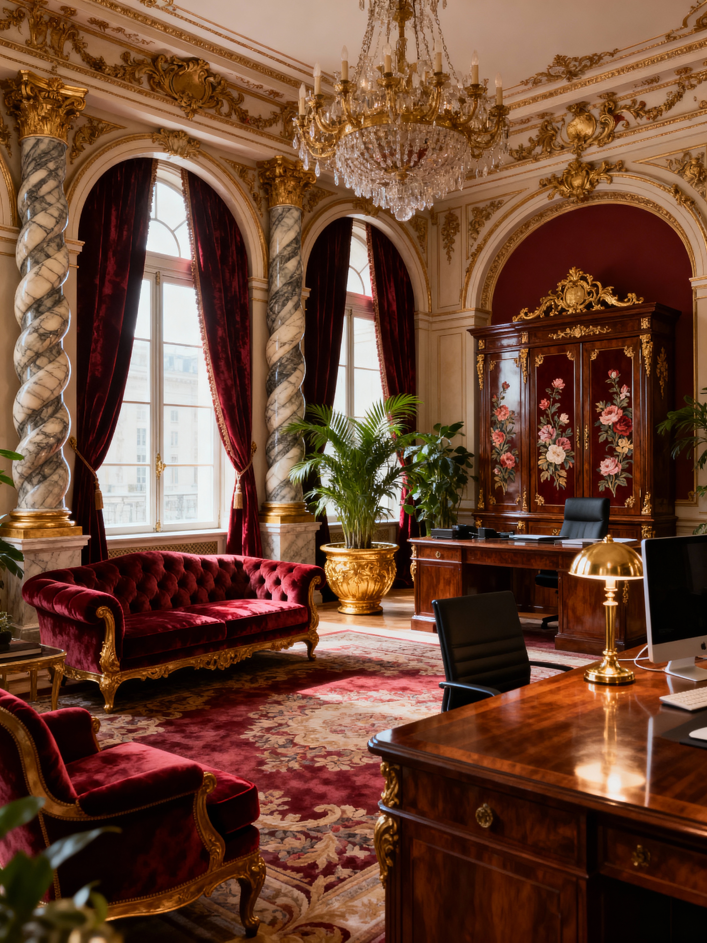 office with baroque style with cabinets and seating area with sofa and office desks and lounge chairs and plants and desk lamps and windows and computer desks. . with grandeur and emotional exuberance and twisted columns and luxurious floral and damask fabrics and expensive and plush flooring and intricate carvings and ornaments and tension and elaborate ornamentation