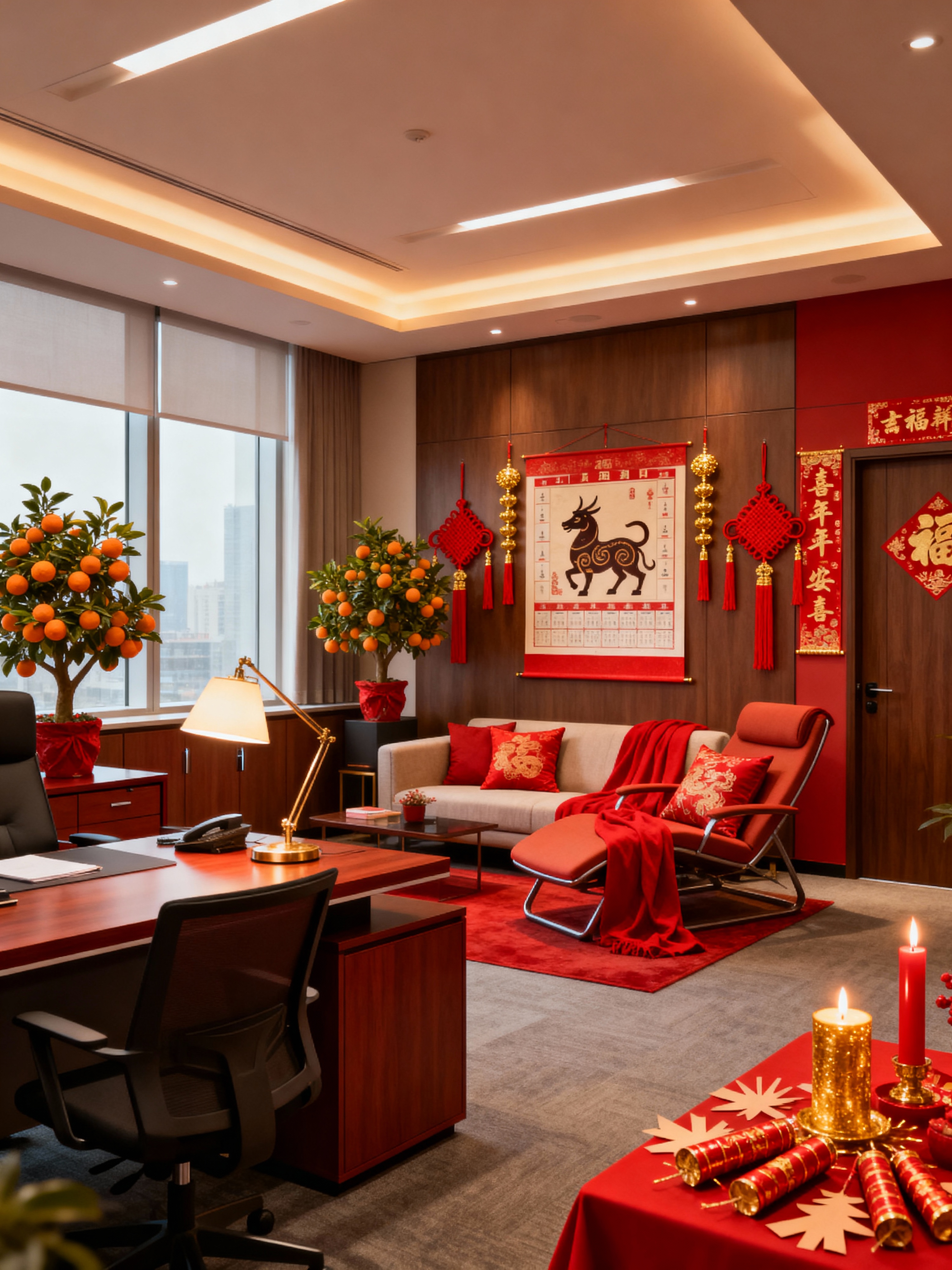 office with chinese new year style with lounge chairs and desk lamps and plants and office desks and seating area with sofa and cabinets and windows and office chairs. . with kumquat trees and red fabric & pillows and red and gold tassels and zodiac calendar and orange trees and red and gold candles and paper firecrackers and door couplets