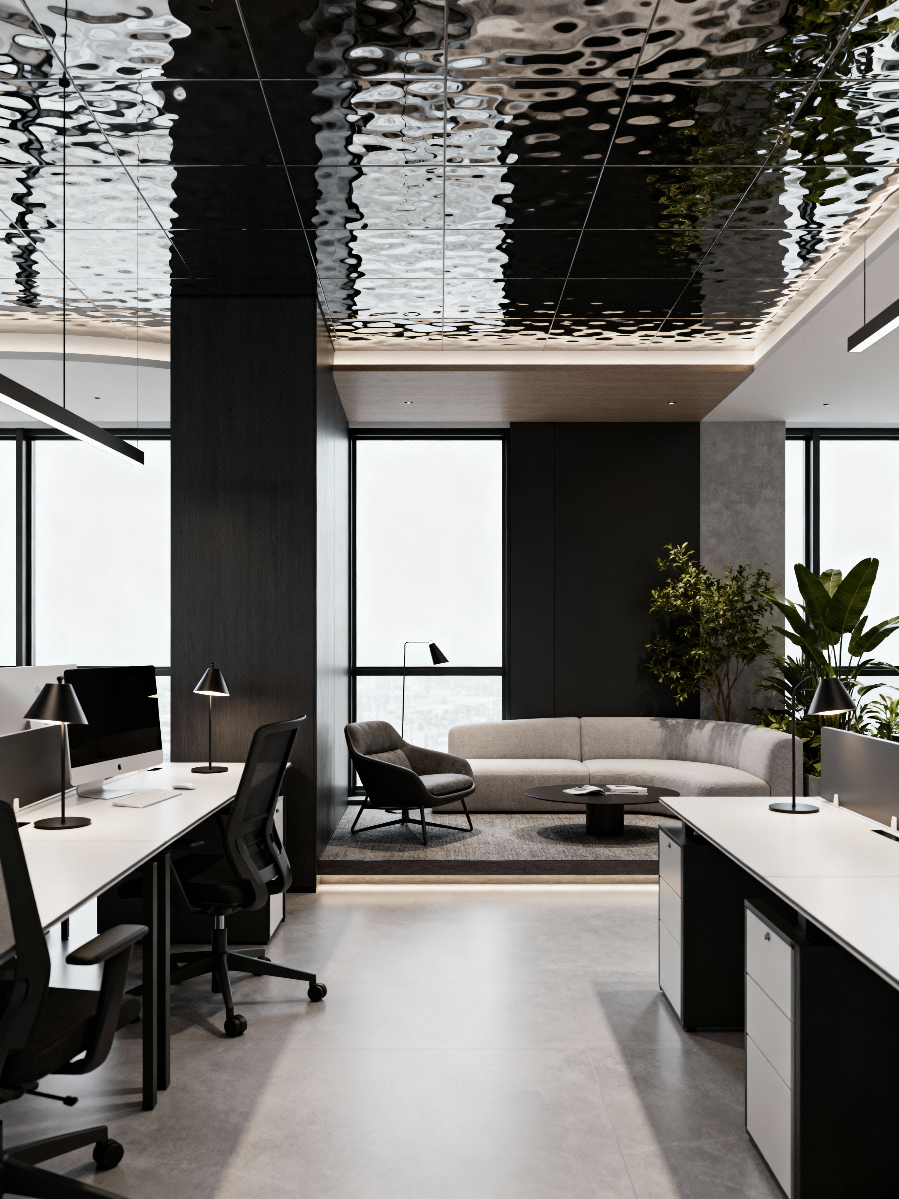 office with contemporary style with office chairs and computer desks and desk lamps and windows and seating area with sofa and lounge chairs and office desks and plants. . with high contrast and modern finishes and glass decor and open spaces and neutral palette and sleek lines and functional design and elegant simplicity