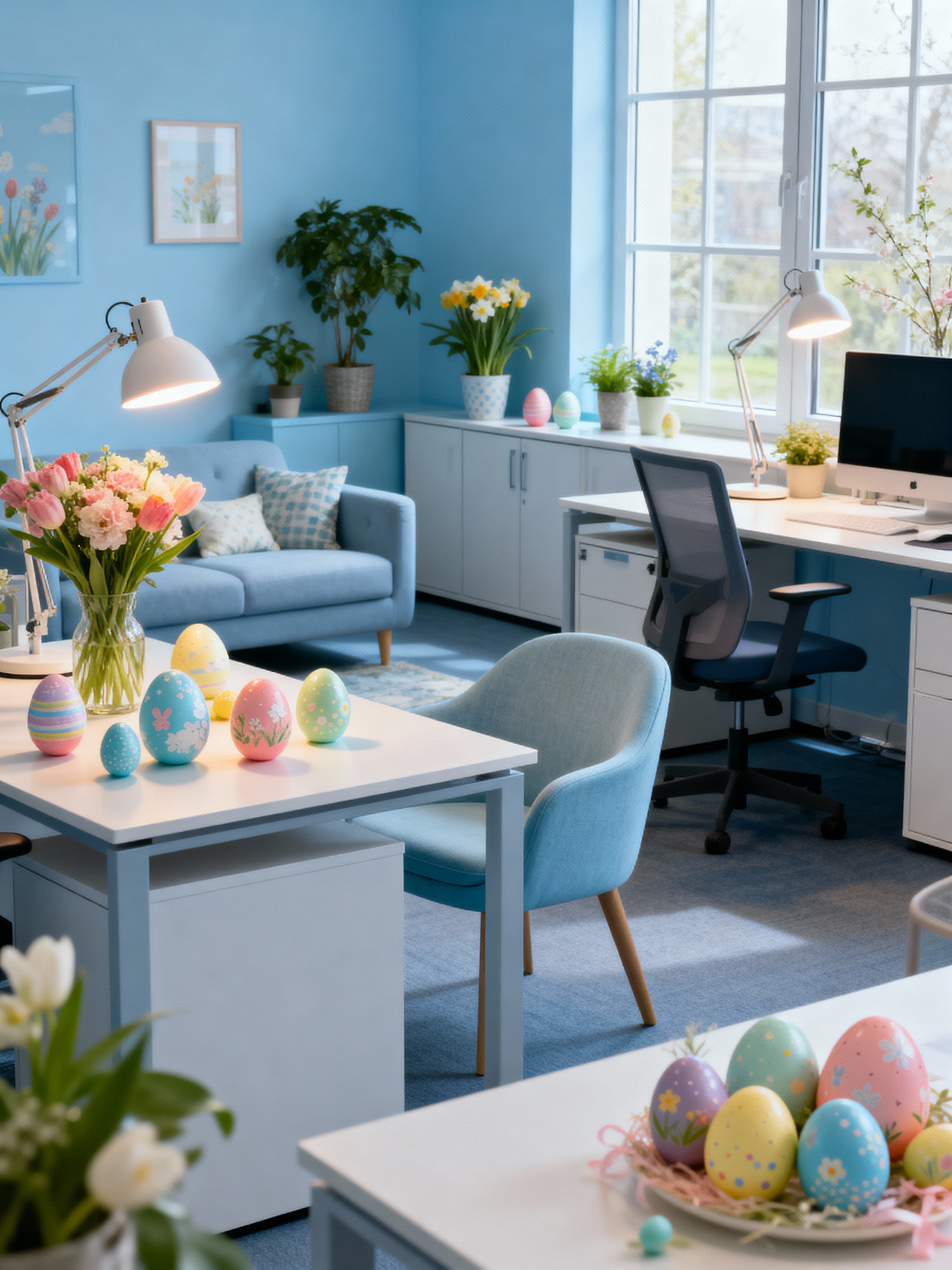 office with easter style with windows and desk lamps and plants and office desks and computer desks and lounge chairs and office chairs and cabinets. . with light blue colors and spring decorations and flowers on table and easter decorations and colorful easter eggs and light blue colors
