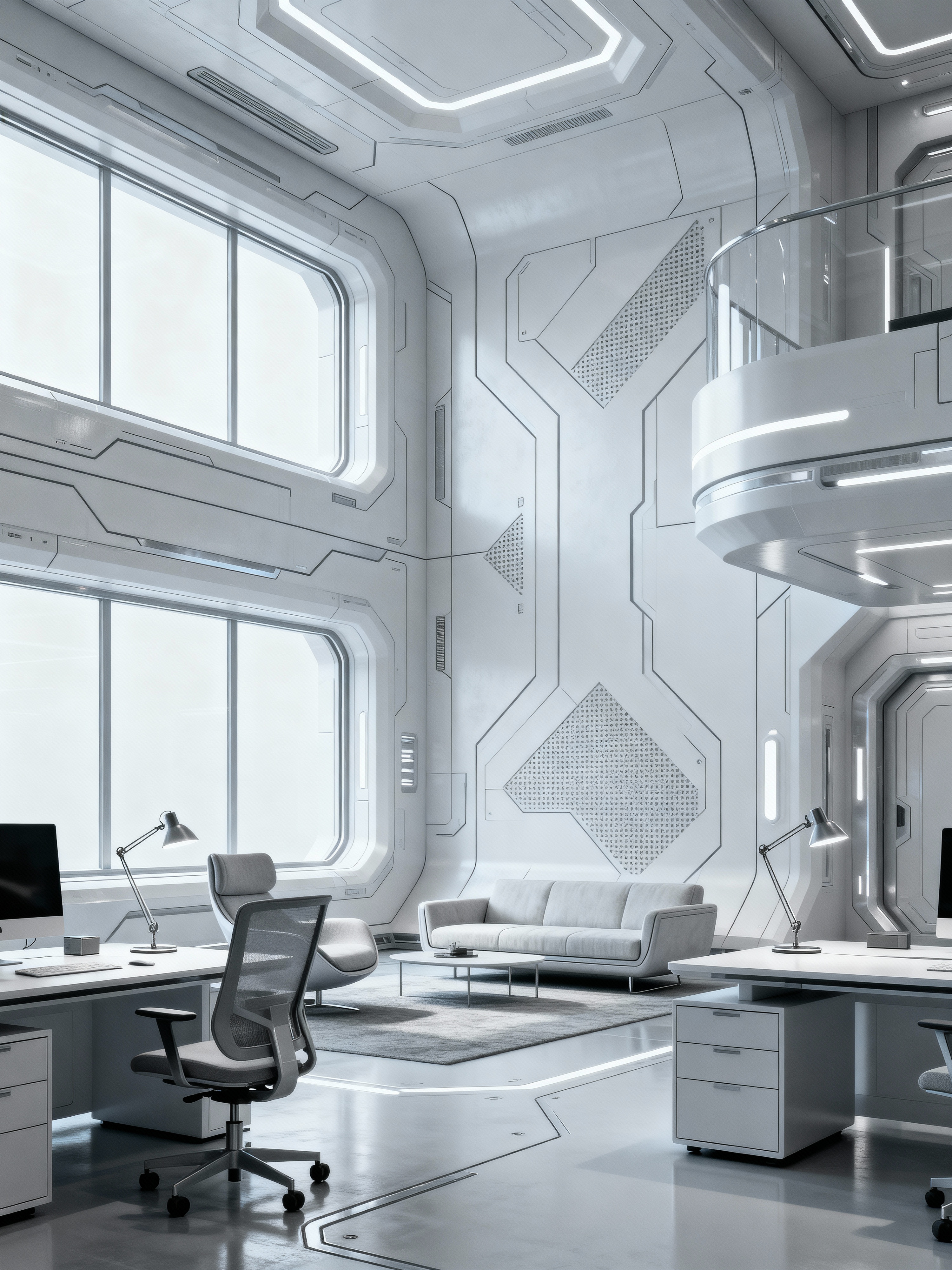 office with futuristic style with office chairs and lounge chairs and seating area with sofa and windows and office desks and desk lamps and cabinets and computer desks. . with monochromatic palette and spaceship interior and strong geometric walls and futurism and floating surfaces and minimalist clean lines and steel finishing and light colors