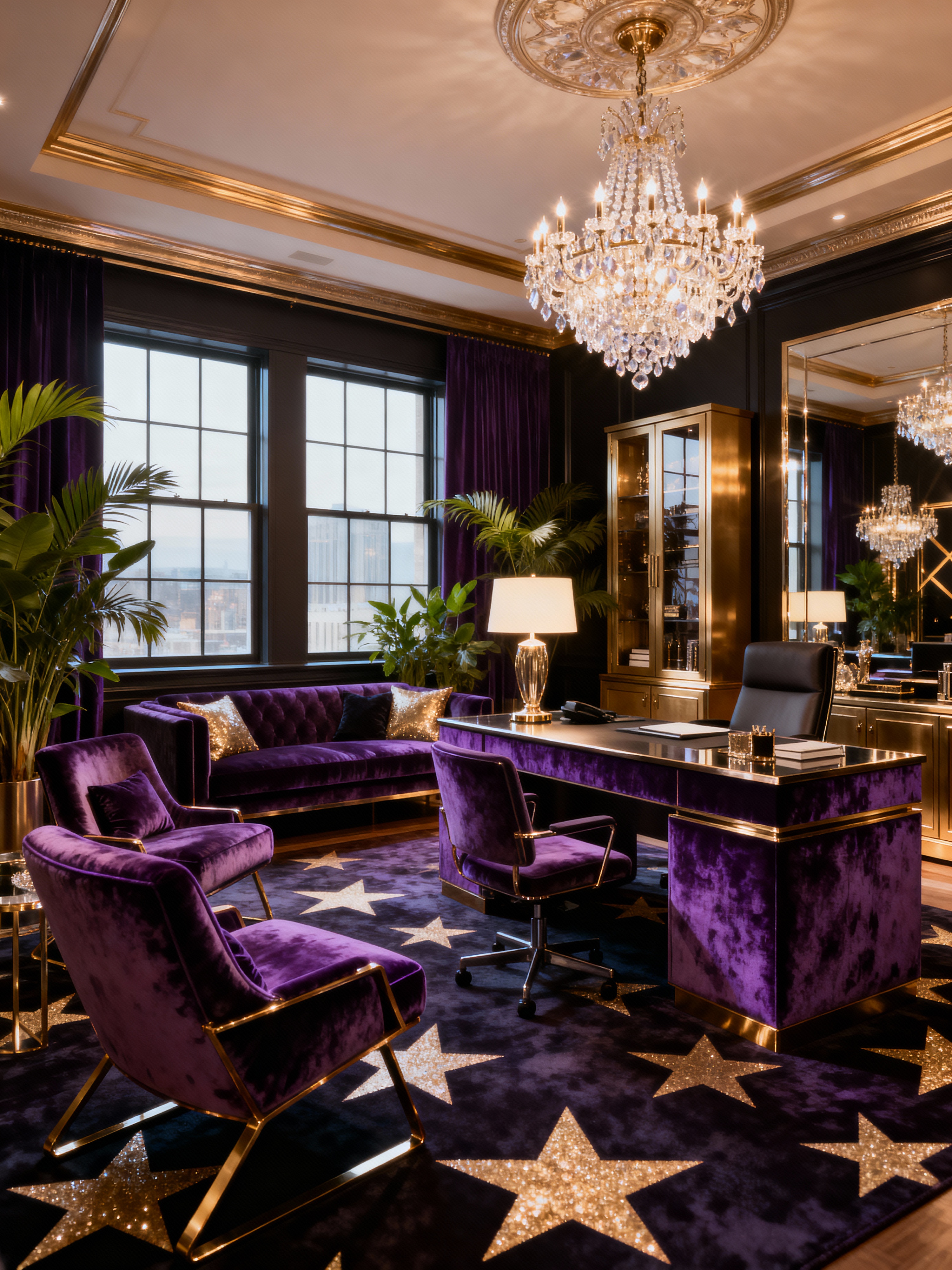 office with hollywood glam style with desk lamps and office desks and seating area with sofa and office chairs and plants and windows and lounge chairs and cabinets. . with bold colors and star quality and crystal chandeliers and luxurious fabrics and opulent details and glamorous style and metallic accents and velvet upholstery