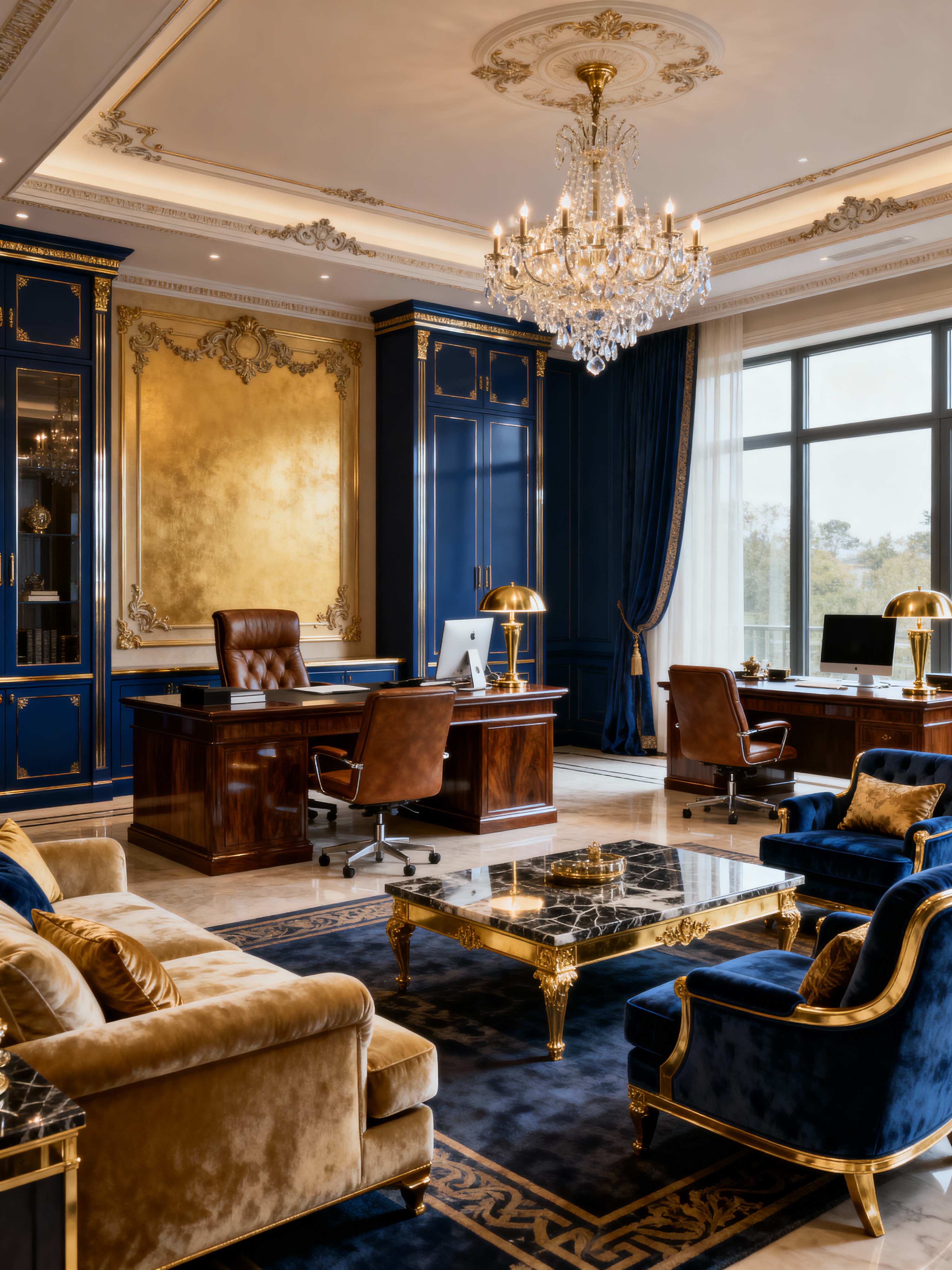 office with luxury style with office chairs and lounge chairs and seating area with sofa and computer desks and cabinets and plants and desk lamps and windows. . with custom pieces and exclusive design and rich textures and premium finishes and lavish comfort and elegant lighting and opulent details and expensive fabrics