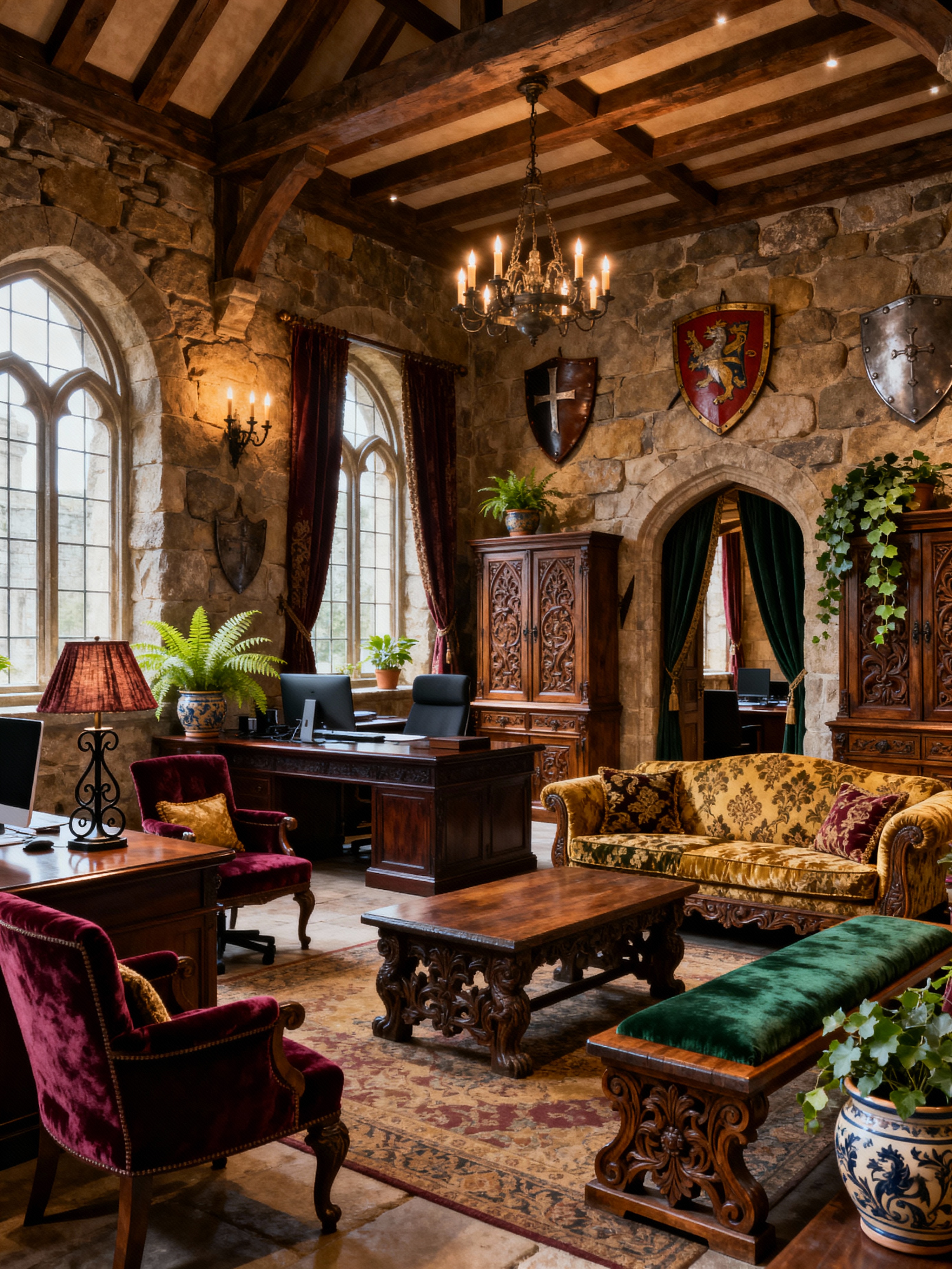 office with medieval style with windows and office chairs and seating area with sofa and cabinets and plants and office desks and computer desks and desk lamps. . with upholstery on chairs and sofas and heavy furniture pieces and castle interior and stone walls and velvet, chenille, damask, and brocade draperies and fabrics and carved wooden benches and medieval shields on the wall and castle interior