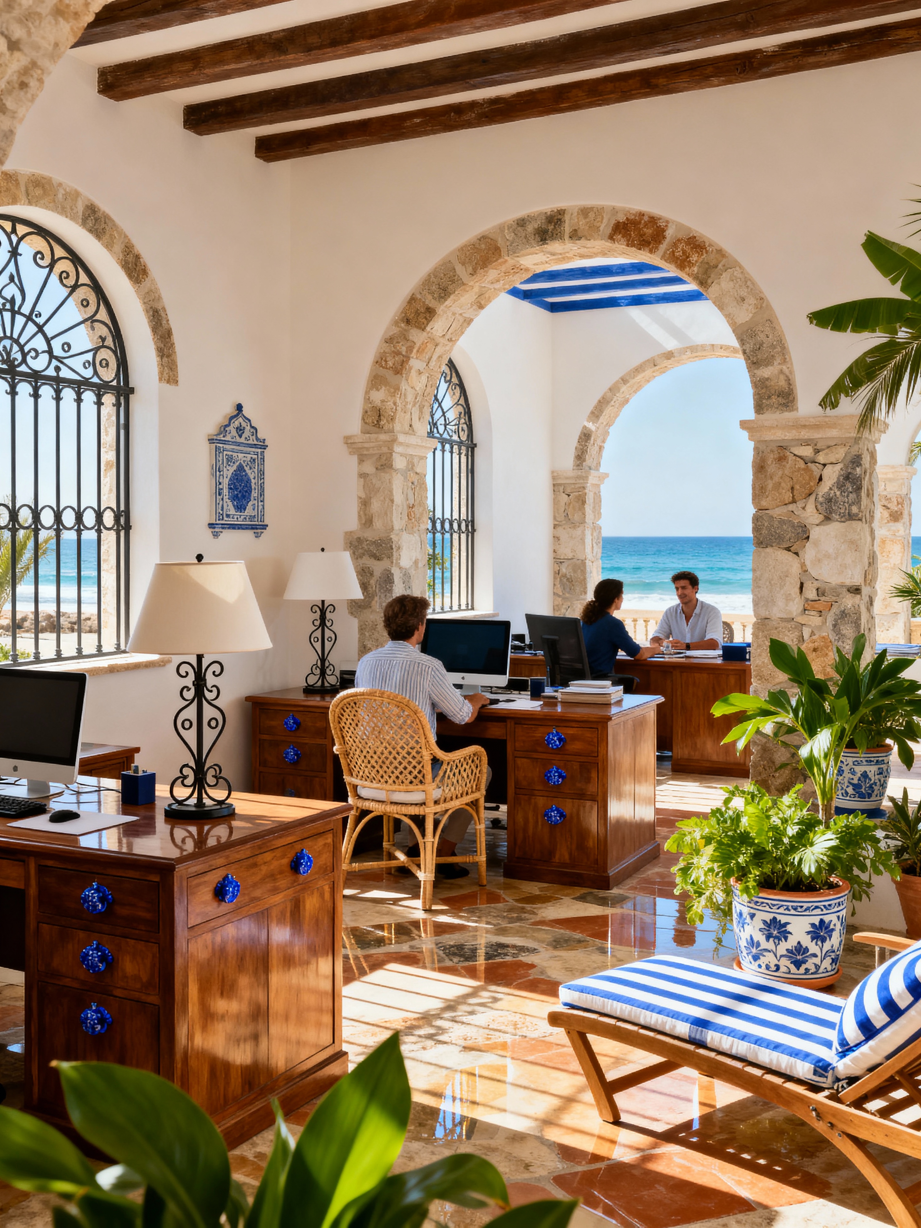 office with mediterranean style with windows and cabinets and desk lamps and office desks and plants and computer desks and office chairs and lounge chairs. . with outdoor living and warm earth tones and coastal influence and blue and white and arched doorways and wrought iron and sun-drenched and stone accents