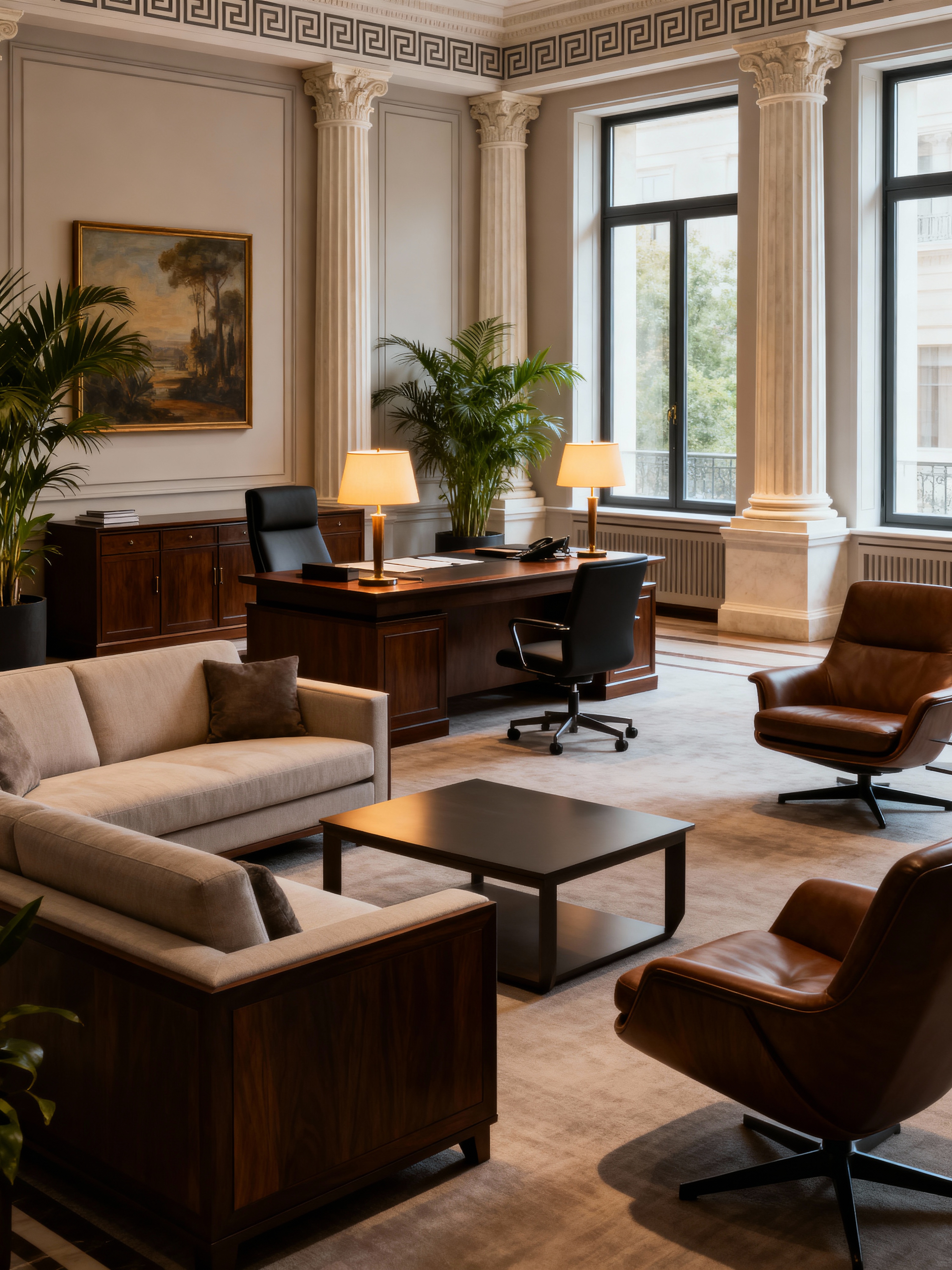 office with neoclassic style with plants and desk lamps and cabinets and office chairs and seating area with sofa and lounge chairs and office desks and windows. . with timeless furniture and emphasized horizontal and vertical lines and geometric decorative elements and timeless artwork and symmetric layouts and classical architectural details and elegant and sophisticated and greek columns