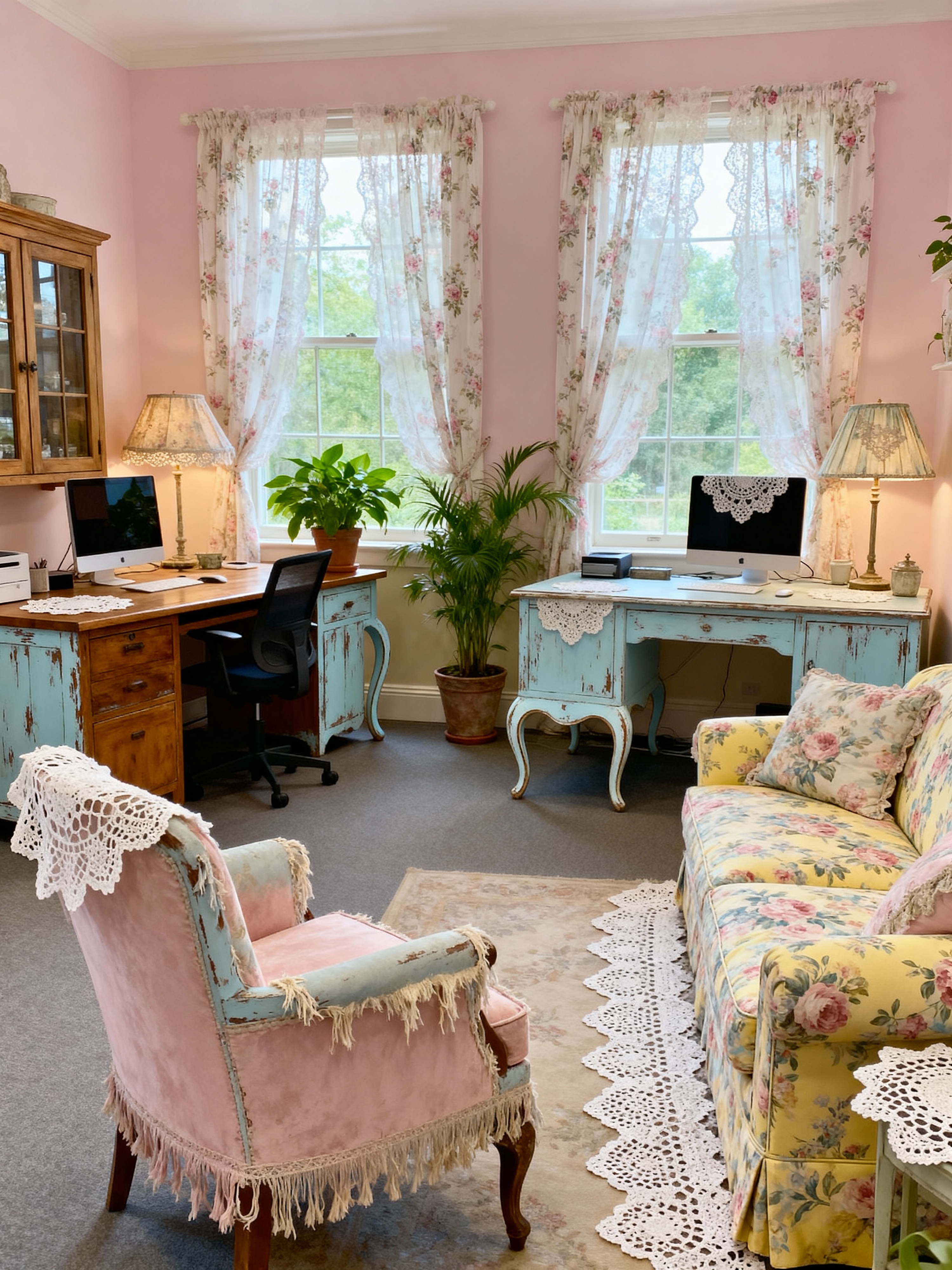 office with shabby chic style with lounge chairs and office desks and windows and seating area with sofa and computer desks and plants and cabinets and desk lamps. . with delicate details and distressed furniture and cottage feel and weathered finishes and soft textures and antique lace and pastel colors and floral patterns