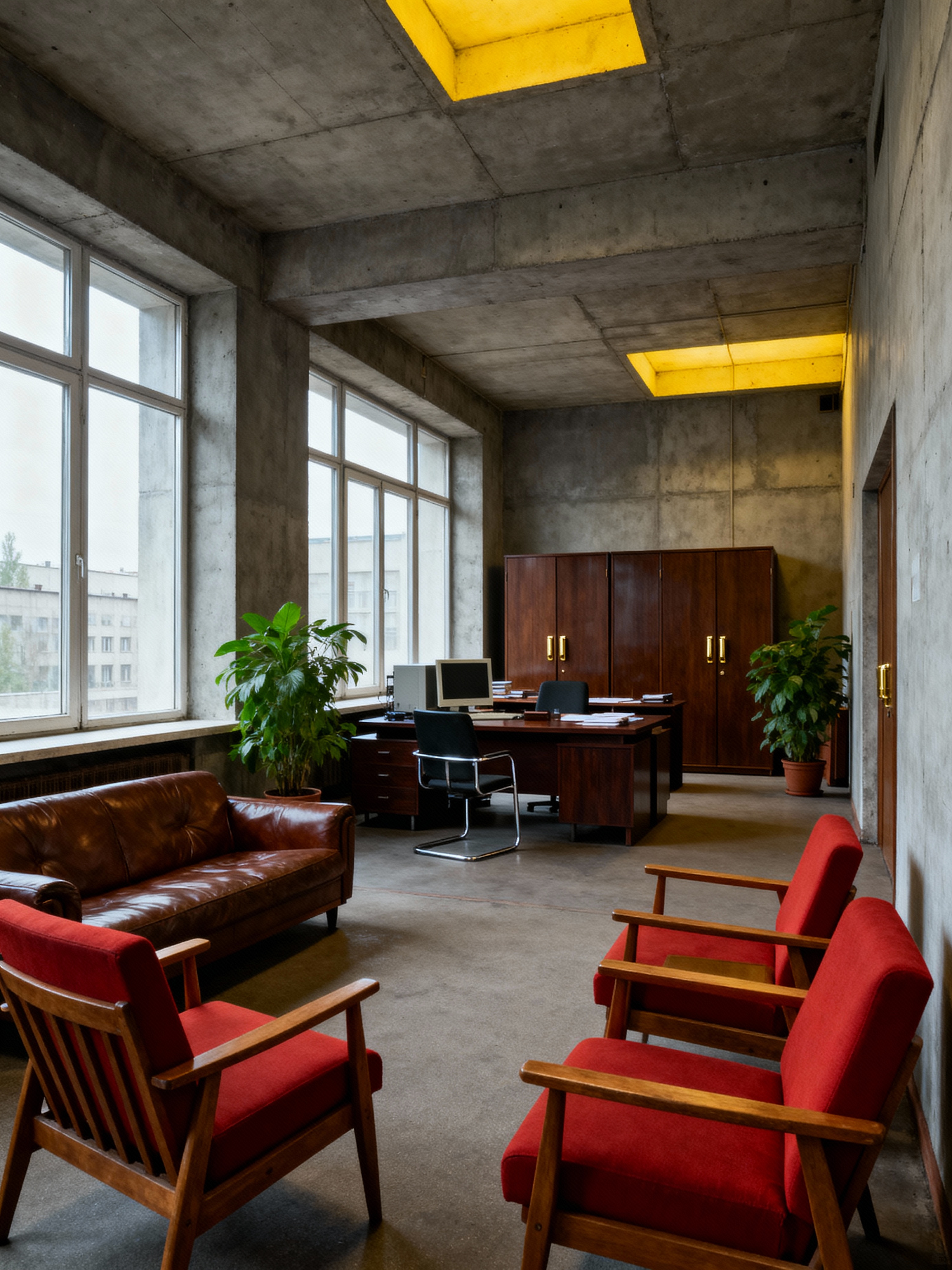 office with soviet style with windows and lounge chairs and seating area with sofa and computer desks and office desks and plants and cabinets and office chairs. . with communist design and brutalist style and eastern bloc and functional furniture and concrete structures and utilitarian design and soviet-era architecture and socialist realism