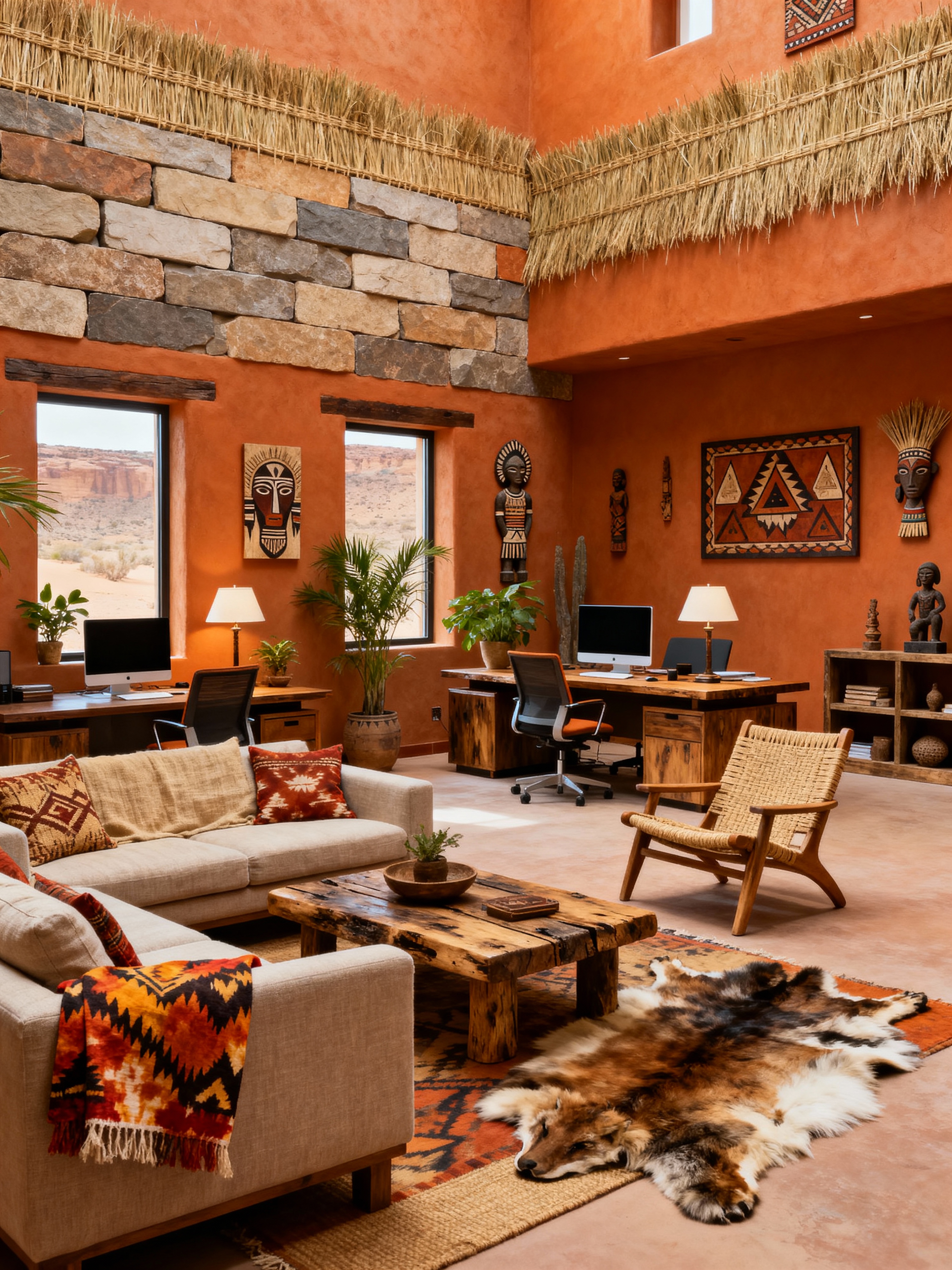 office with tribal style with seating area with sofa and office chairs and lounge chairs and plants and windows and office desks and desk lamps and computer desks. . with animal furslinen and planks of stone and intricate grass weaving and hand dyed batik fabrics and desert colours and tribal revival and sculptures and artworks and smooth worn timbers