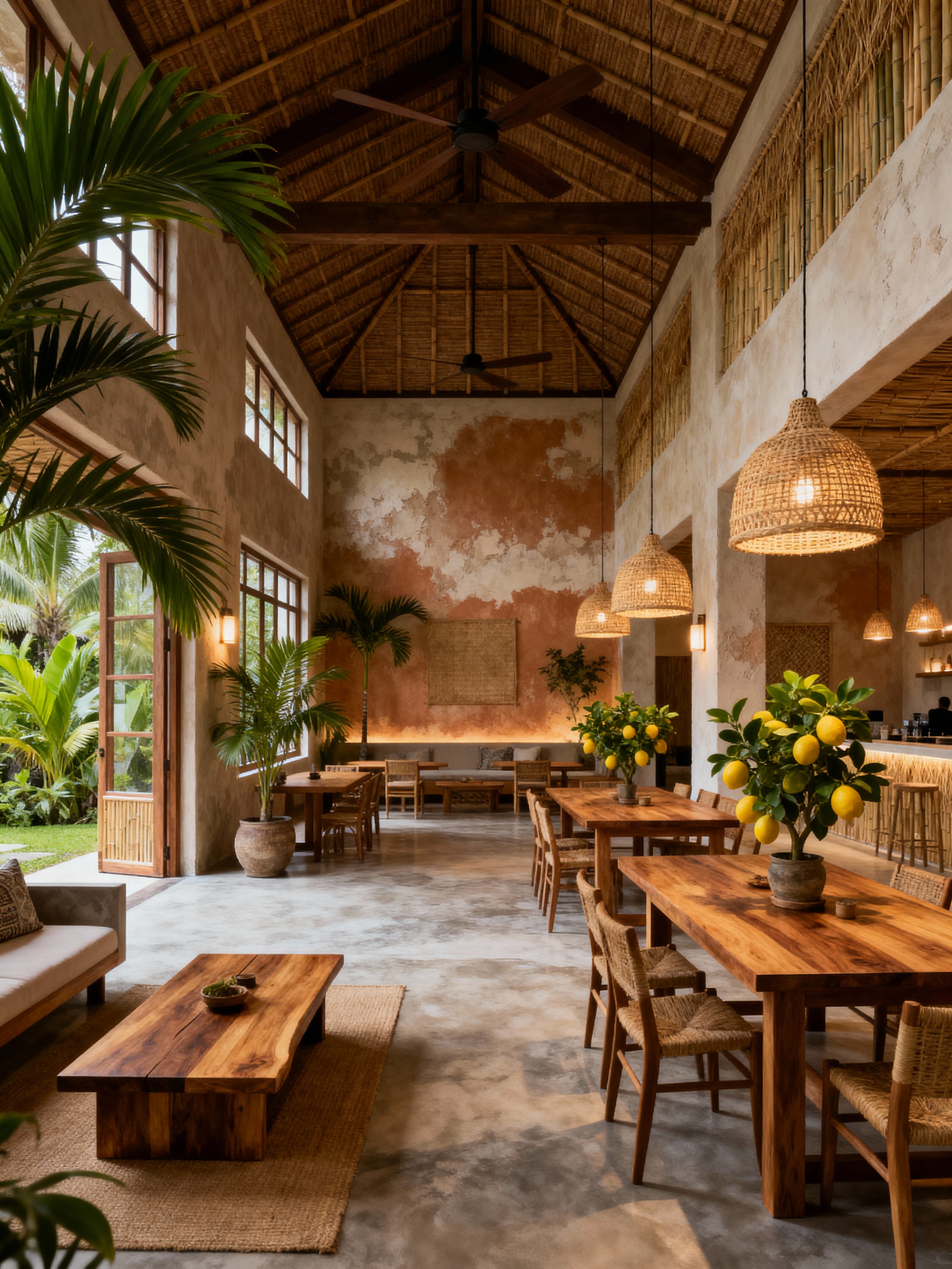 onsen with bali style . with wooden coffee and dining tables and lush tropical plants (palms, lemon trees) and open high ceilings with fans and warm ambient lighting and woven pendant lamps and microcement floors and raffia or bamboo accents and textured plaster or stucco finish