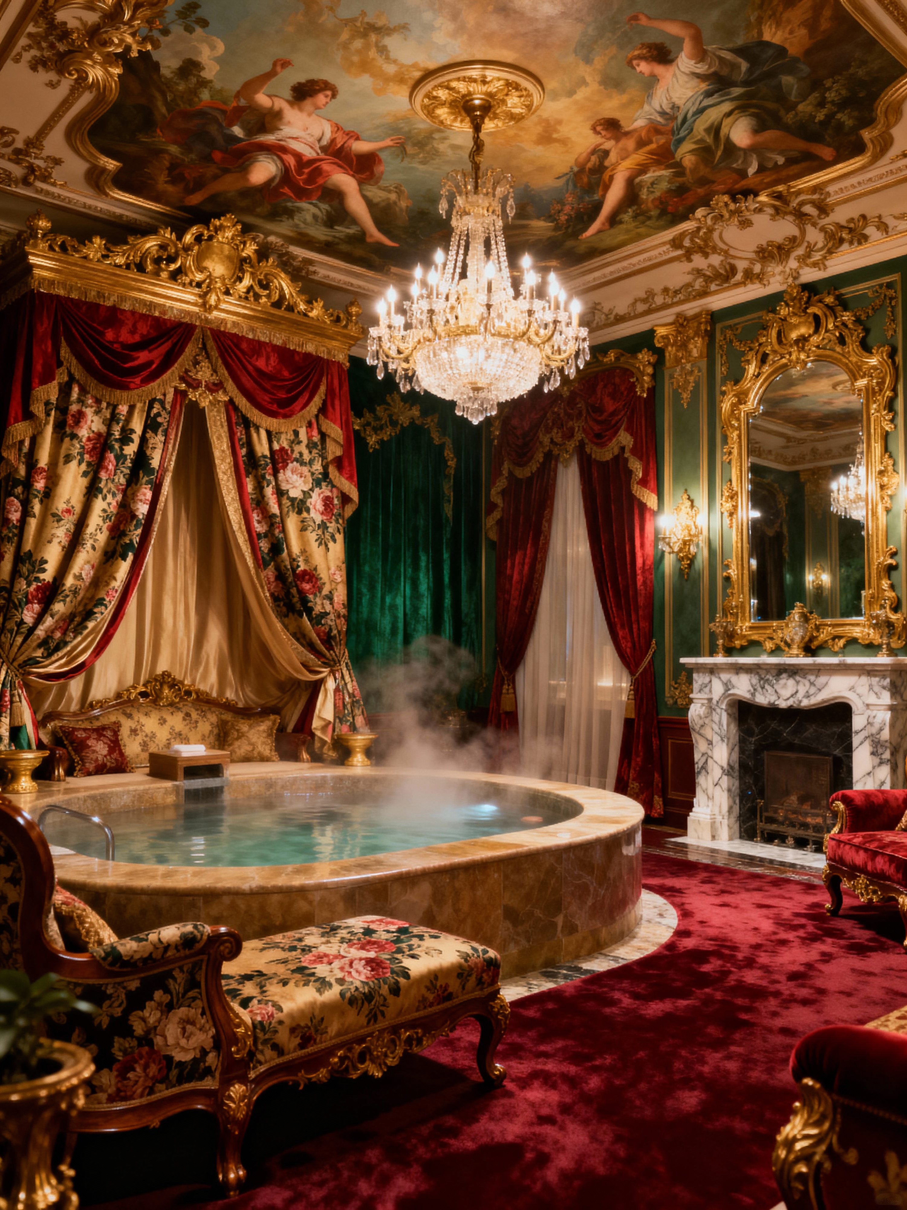 onsen with baroque style . with movement and grandeur and luxurious floral and damask fabrics and intricate carvings and ornaments and expensive and plush flooring and drama and heavy moldings and pedestal feet