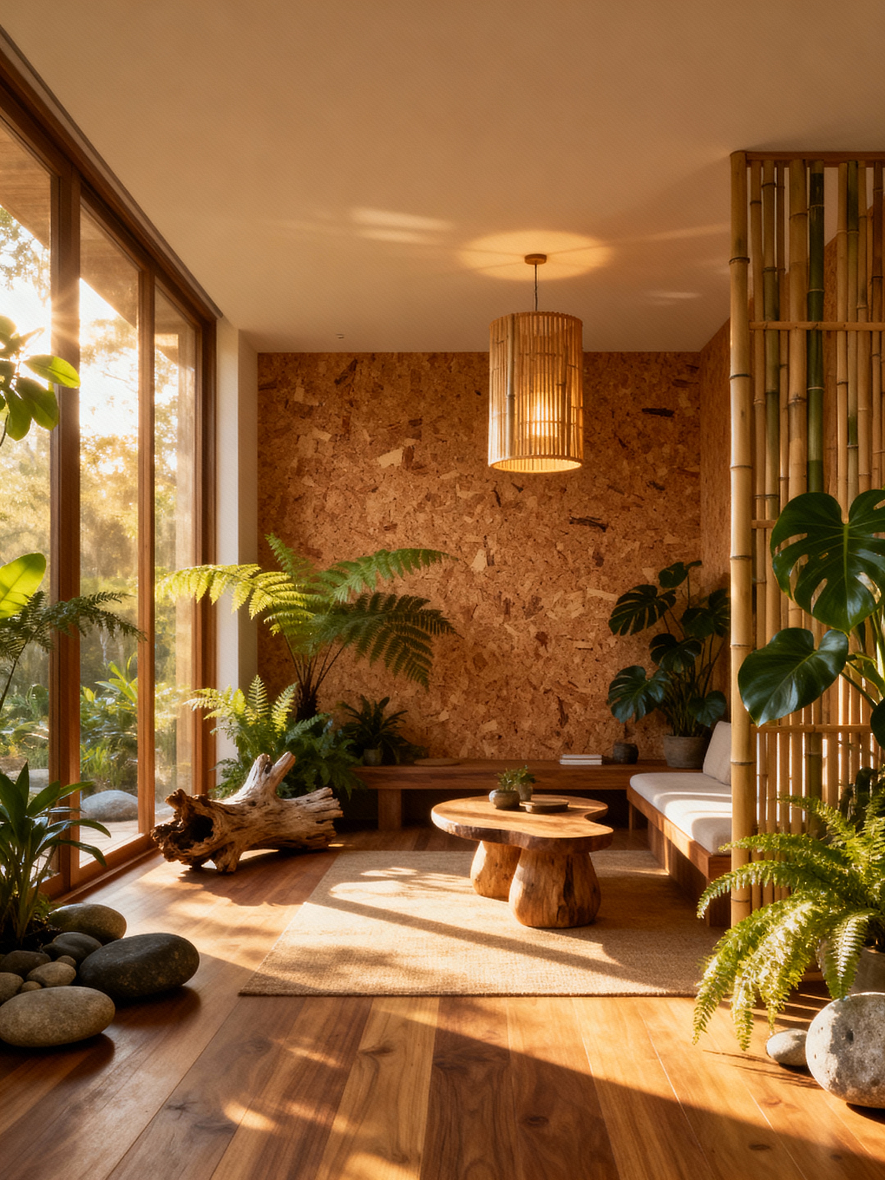 onsen with biophilic style . with sunlight and wood materials and features of nature and plants and cork materials and bamboo materials and images of nature and natural elements