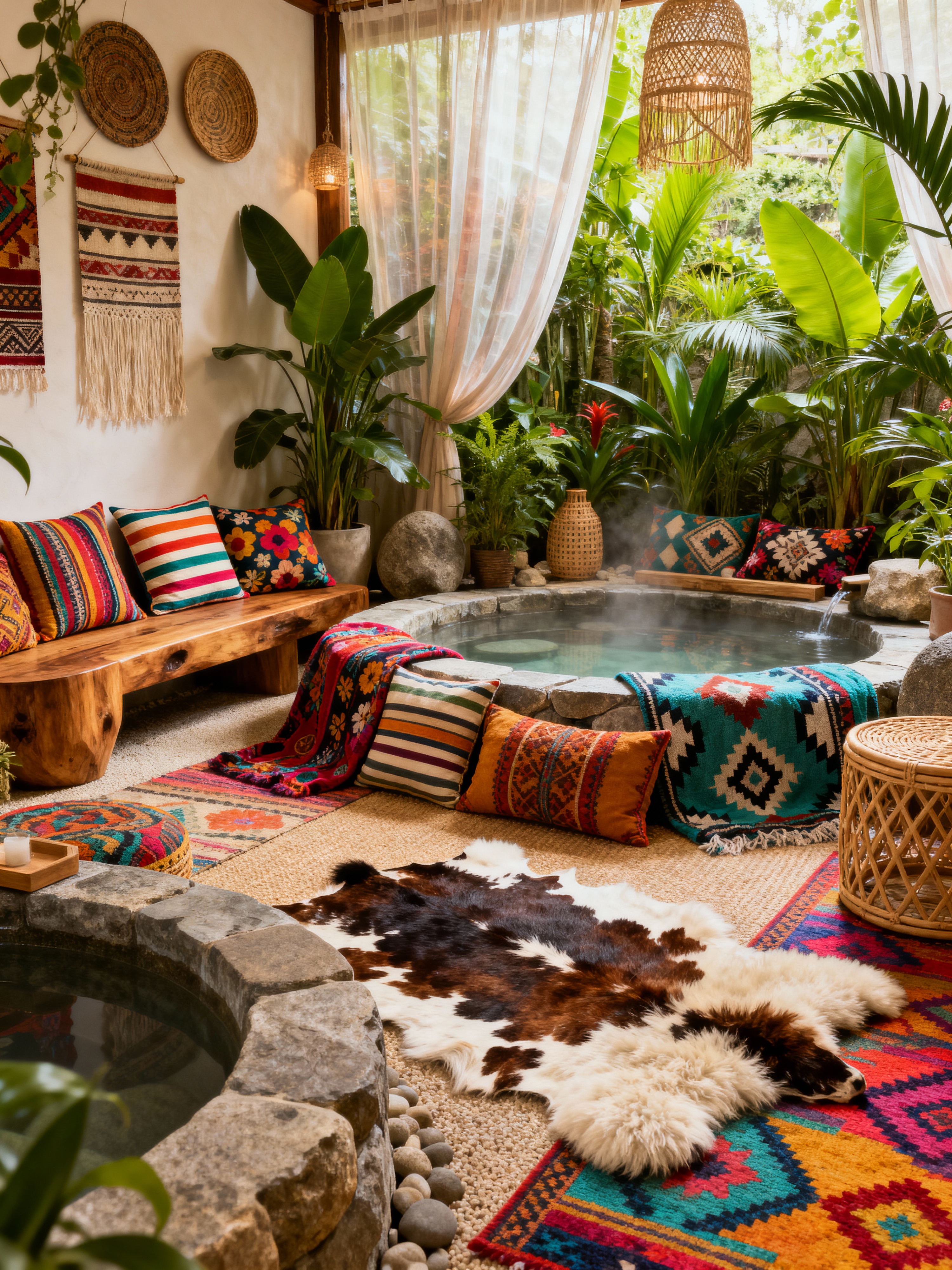 onsen with bohemian style . with bold colors and a lack of structure and playful patterns and playful textures and mixed patterns and natural materials and lush green nature and animal hides