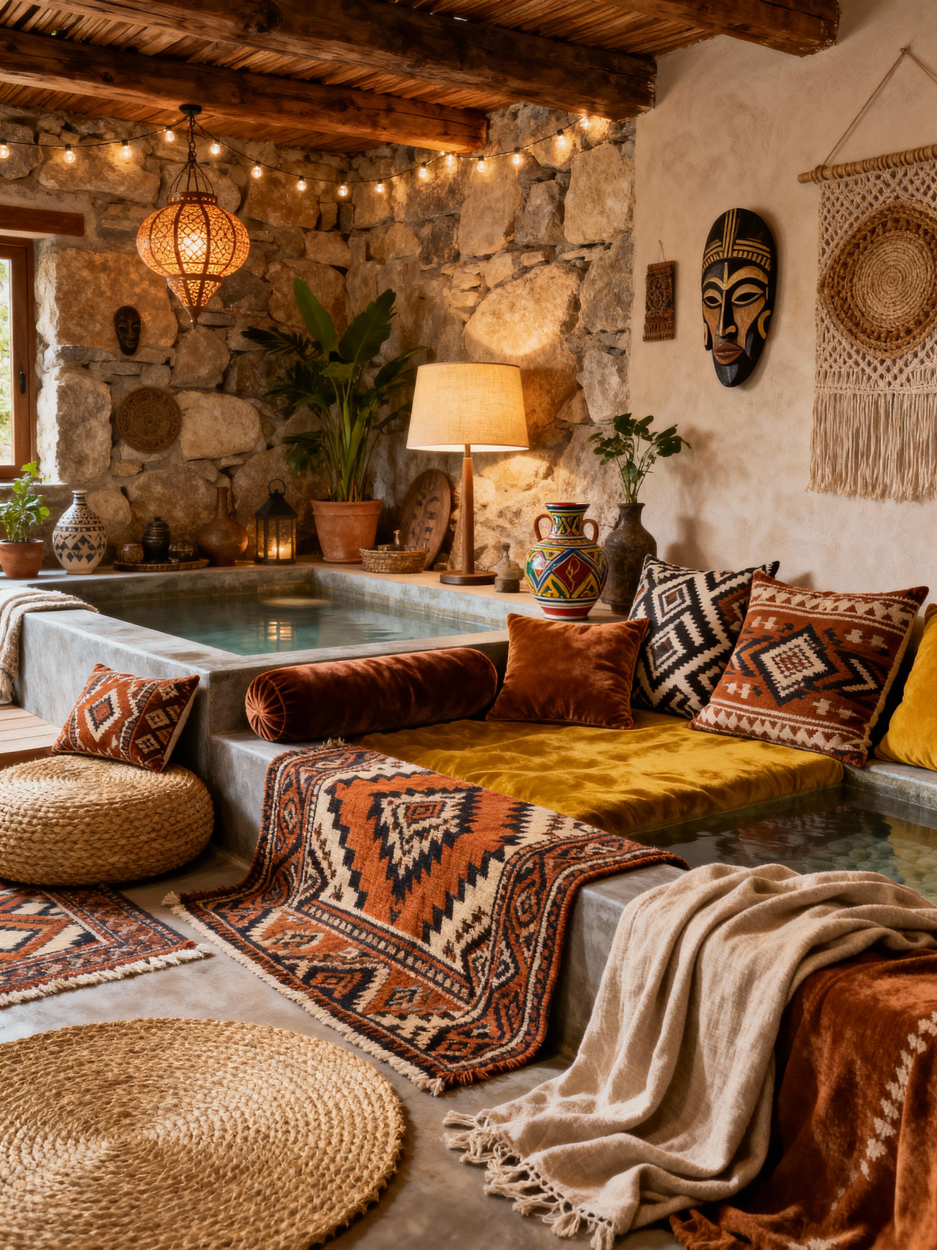 onsen with boho-chic style . with artistic touches and earthy colors and relaxed atmosphere and mixed patterns and layered textiles and global artifacts and natural materials and bohemian flair