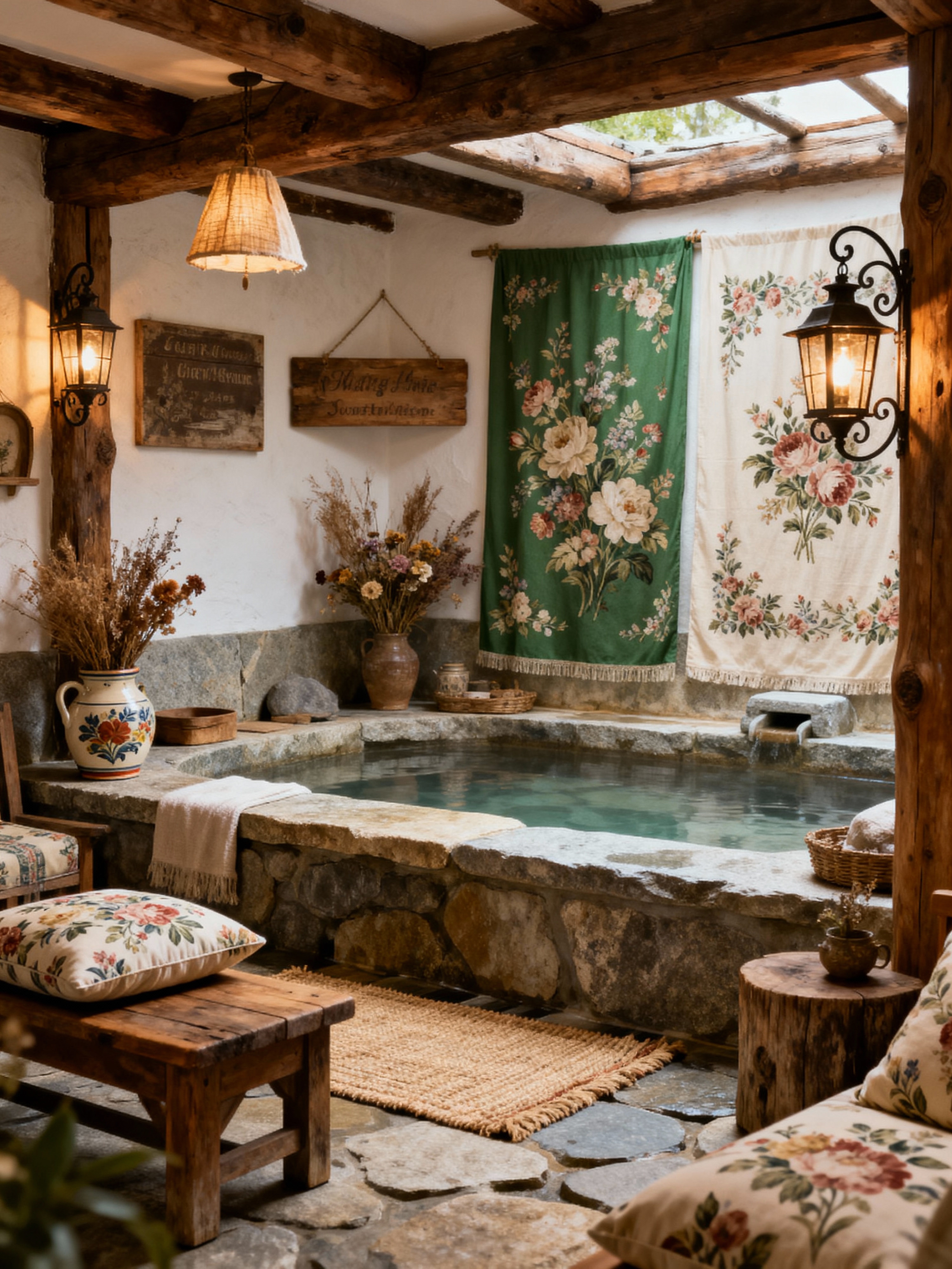 onsen with cottagecore style . with rustic and organic and floral patterns and earthy and natural and cottage style and country style and traditional