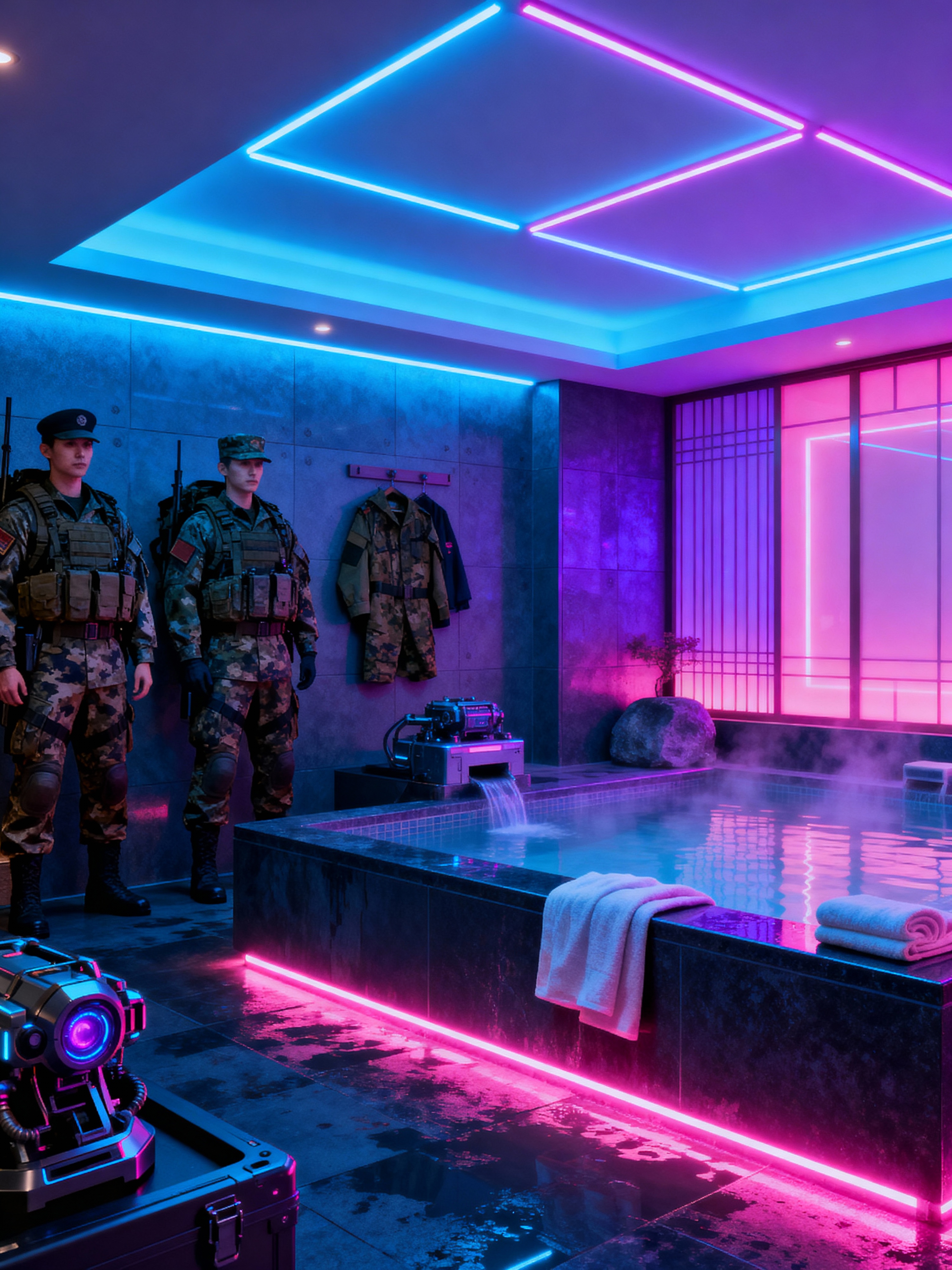 onsen with cyberpunk style . with led lights and cyberpunk lights and clean straight square lines and cyberpunk style and bladerunner style and military uniforms and gear and synthetic objects and synthwave