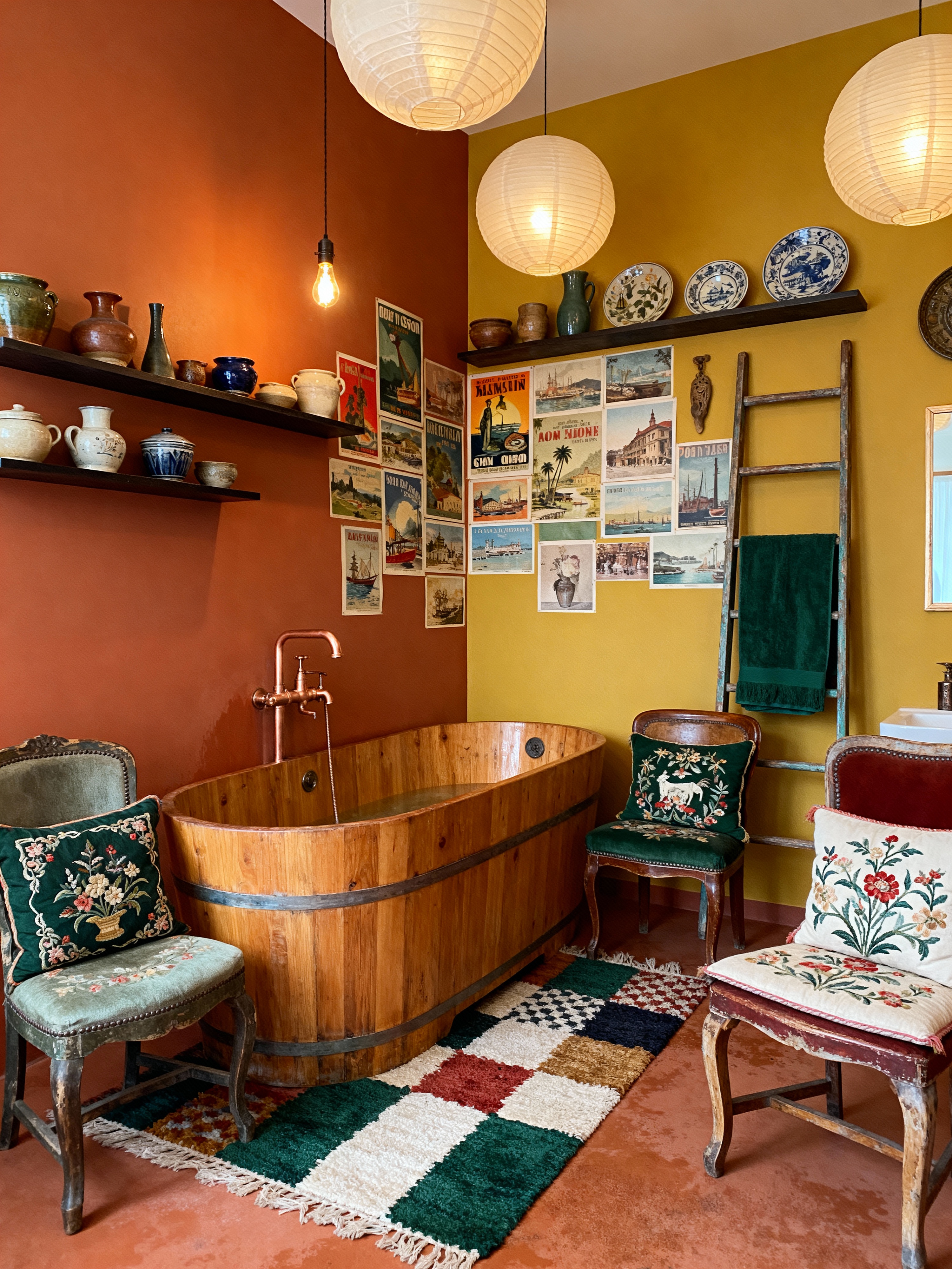 onsen with eclectic style . with mixed styles and artistic flair and unique pieces and creative freedom and unexpected elements and personal expression and layered textures and vintage finds