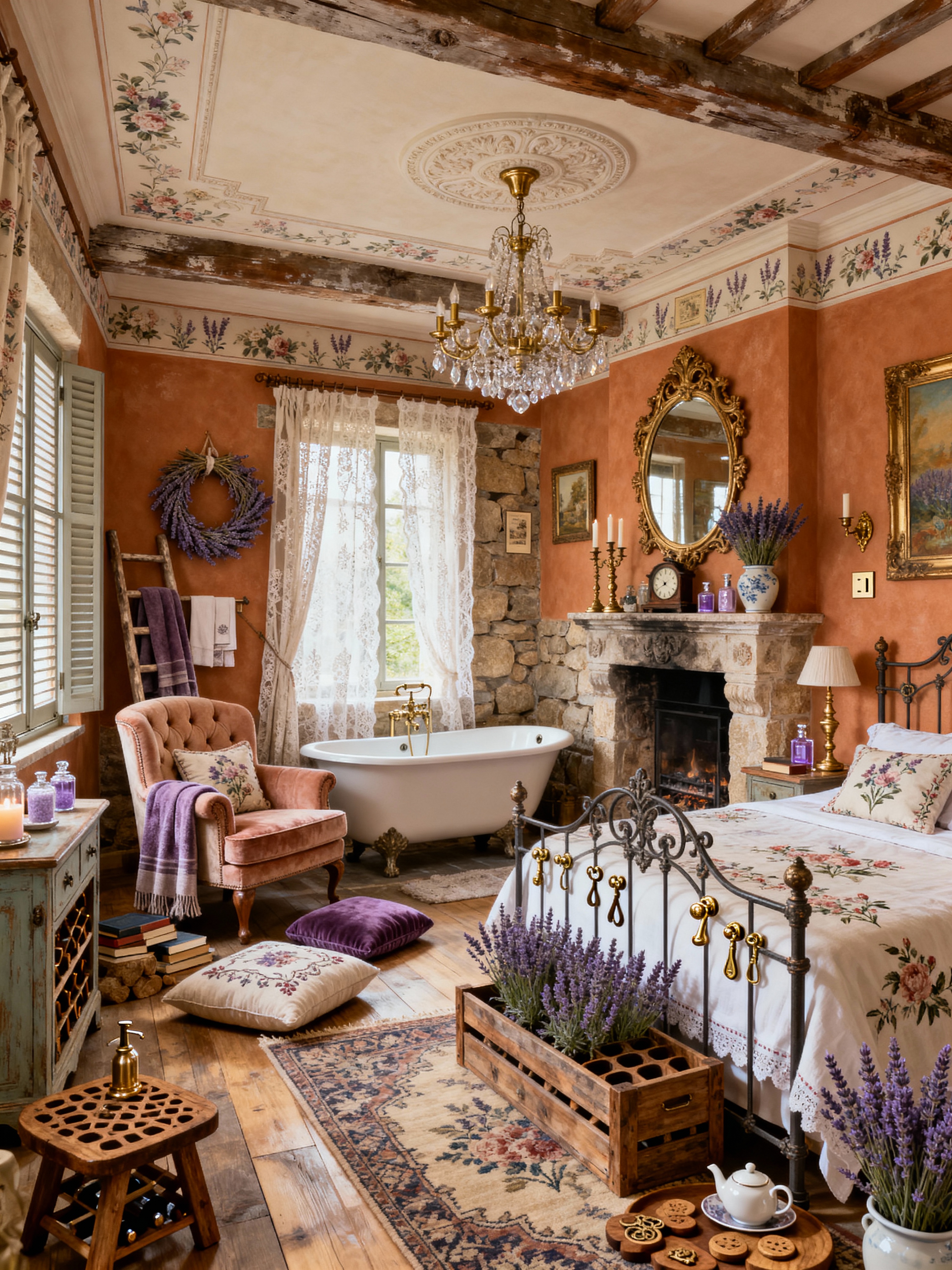 onsen with french country style . with soft fabrics and chandeliers and lavender accents and antique decor and distressed wood and vintage furniture and warm tones and ornate details